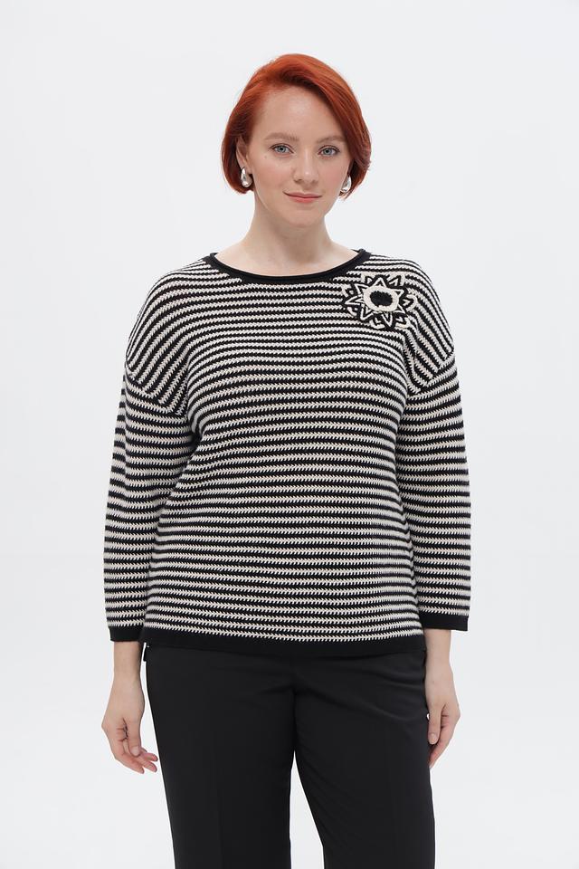 Женский пуловер Rabe collection бело-черной расцветки, выполнен из мягкого трикотажа с узором в полоску. Модель дополнена декоративной аппликацией в форме цветка. Состав: 70% полиакрил, 30% хлопок. Состав: полиакрил 70%, хлопок 30%