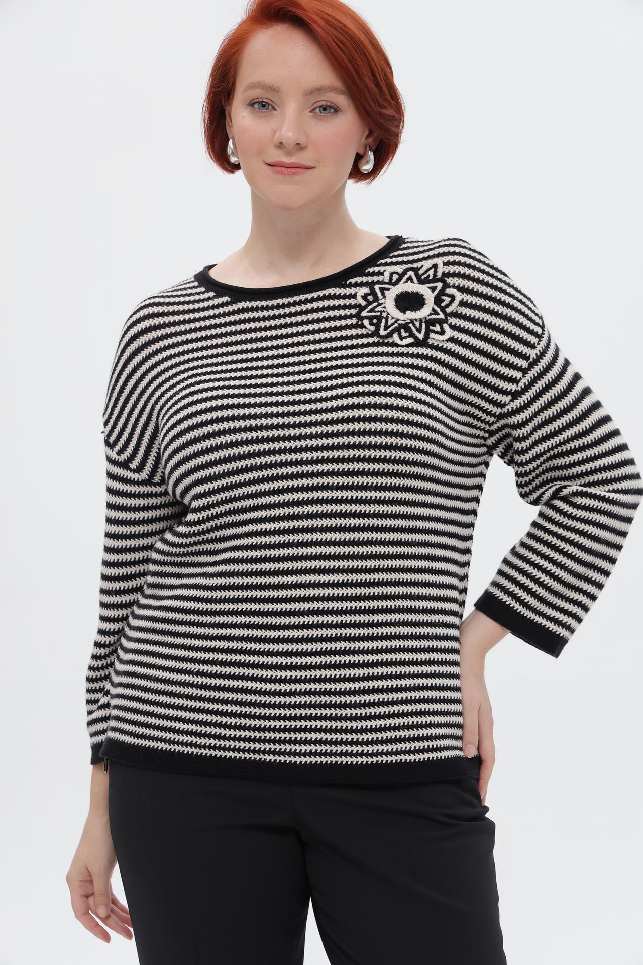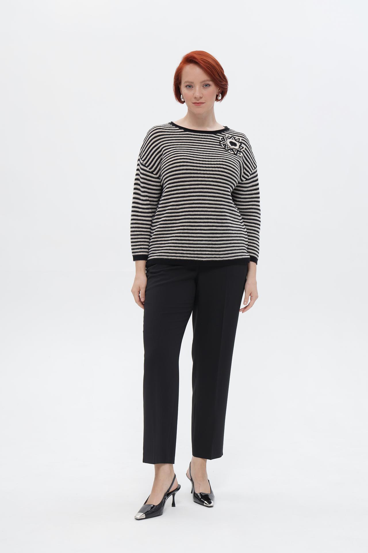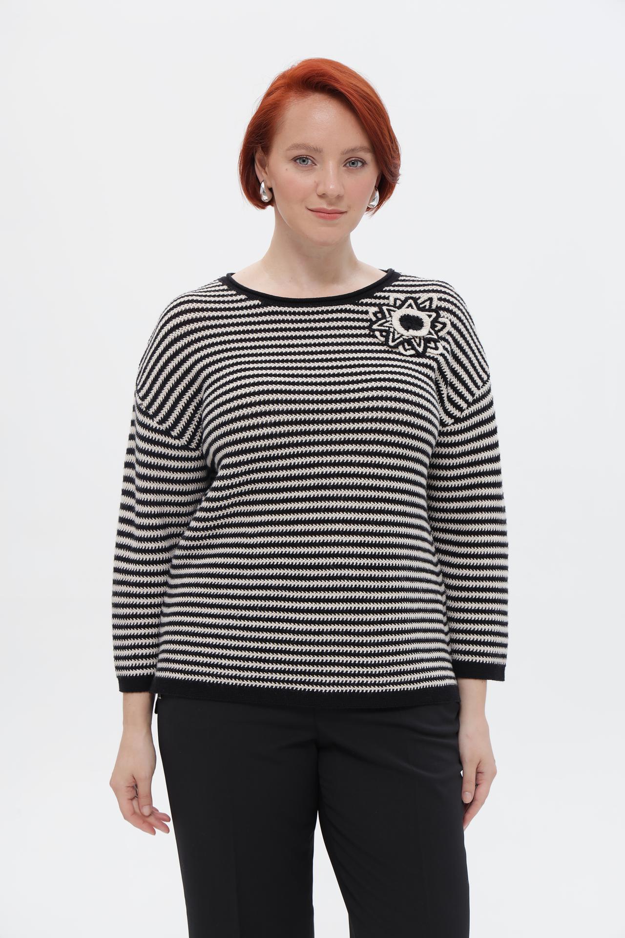 Элегантный пуловер от Rabe collection – идеальное дополнение к вашему повседневному и деловому гардеробу. Классический черно-белый полосатый дизайн придает изделию стильный вид, а оригинальная брошь-цветок на груди добавляет изысканности. Пуловер прекрасно сочетается с брюками и юбками, создавая завершенный образ.