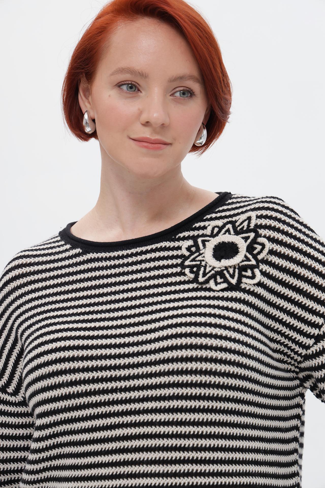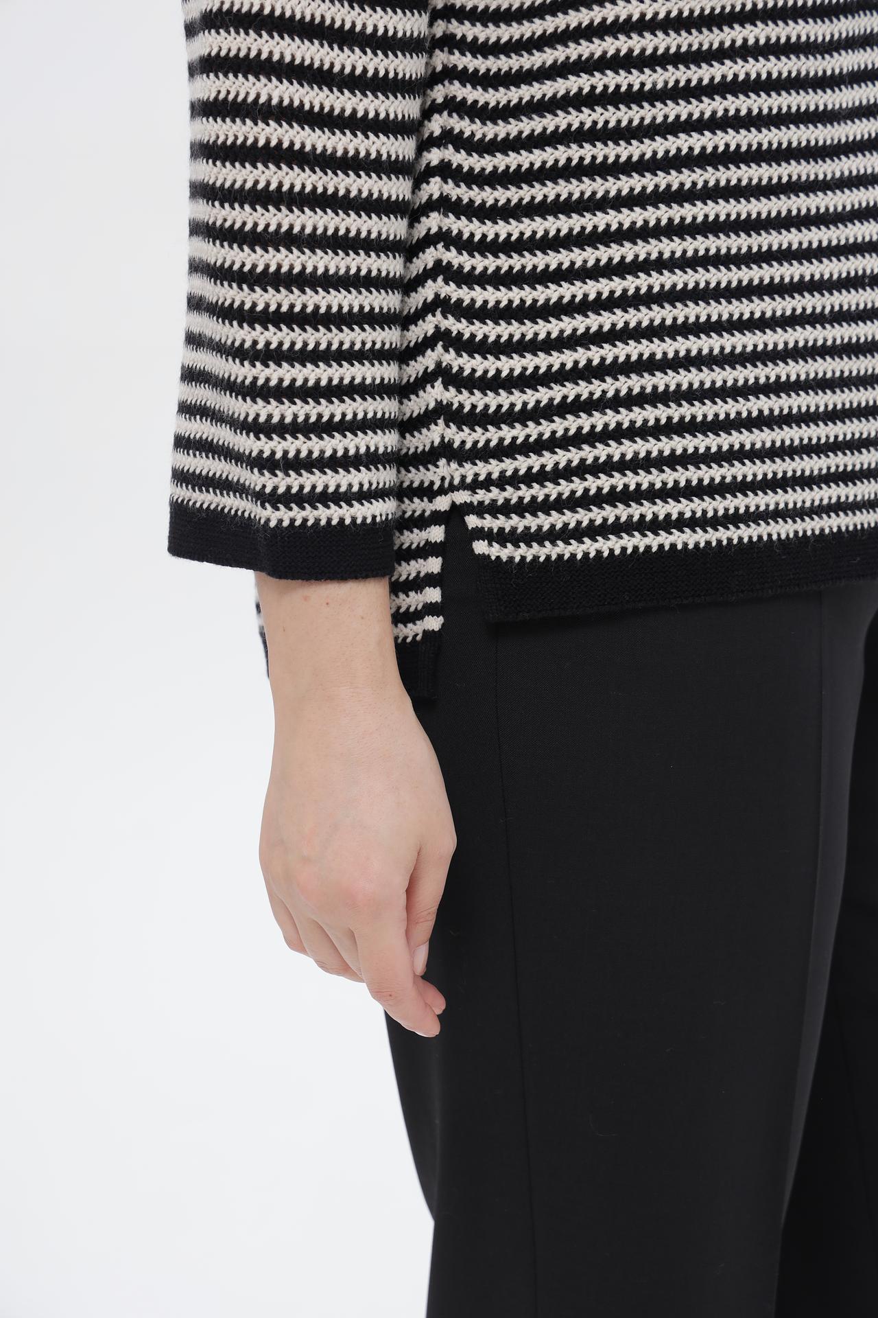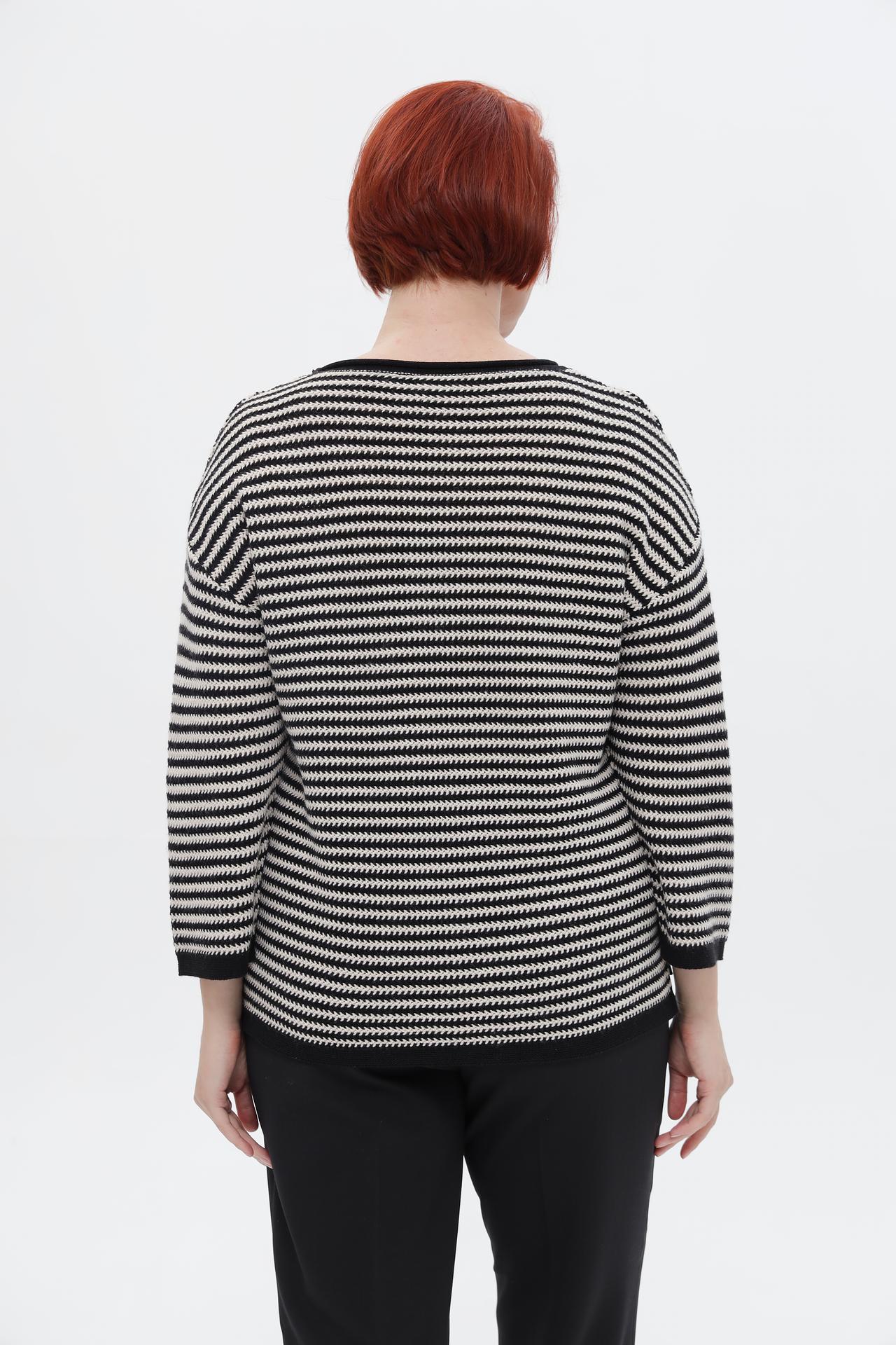 Элегантный пуловер от Rabe collection – идеальное дополнение к вашему повседневному и деловому гардеробу. Классический черно-белый полосатый дизайн придает изделию стильный вид, а оригинальная брошь-цветок на груди добавляет изысканности. Пуловер прекрасно сочетается с брюками и юбками, создавая завершенный образ.
