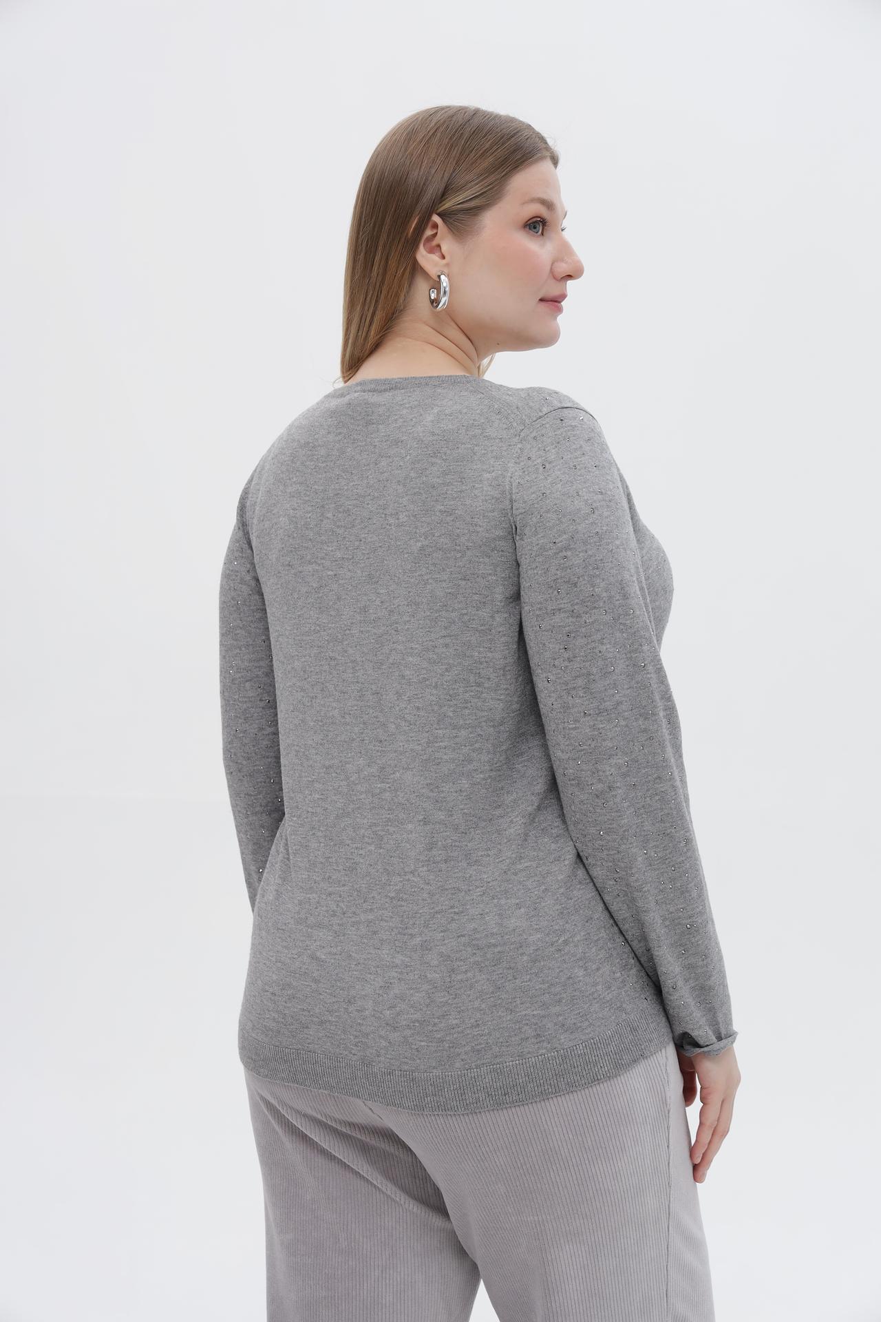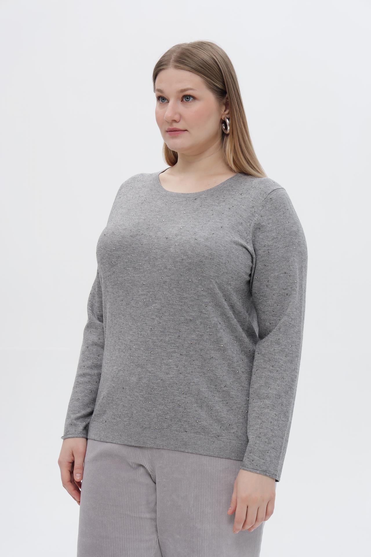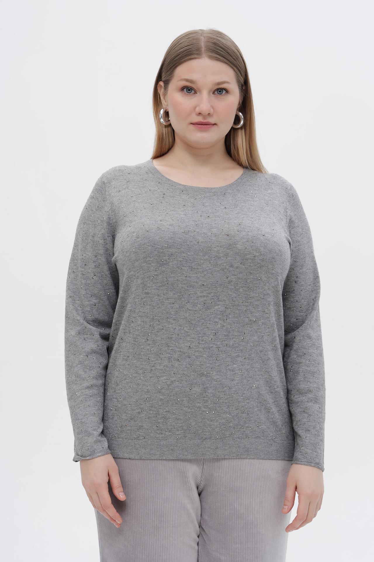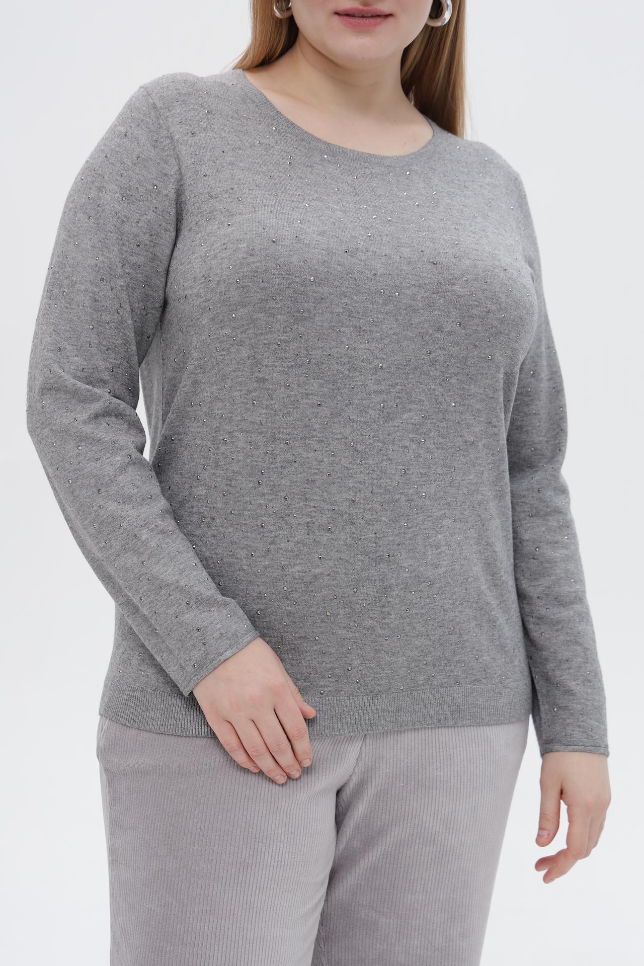 • Дизайн: Классический силуэт и универсальный серый цвет делают этот пуловер легко сочетаемым с любым низом. Мелкие сверкающие стразы добавляют изысканности и праздничности, превращая базовую вещь в акцентный элемент образа.