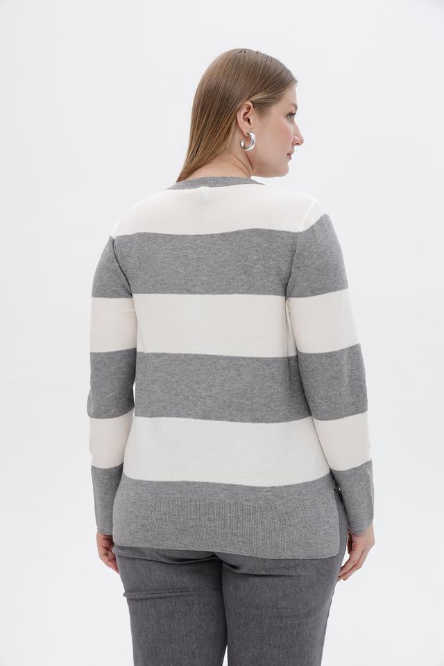 Этот стильный пуловер от Rabe collection станет прекрасным дополнением к вашему гардеробу. Модель выполнена в сером цвете с горизонтальными полосами бежевого и белого оттенков.