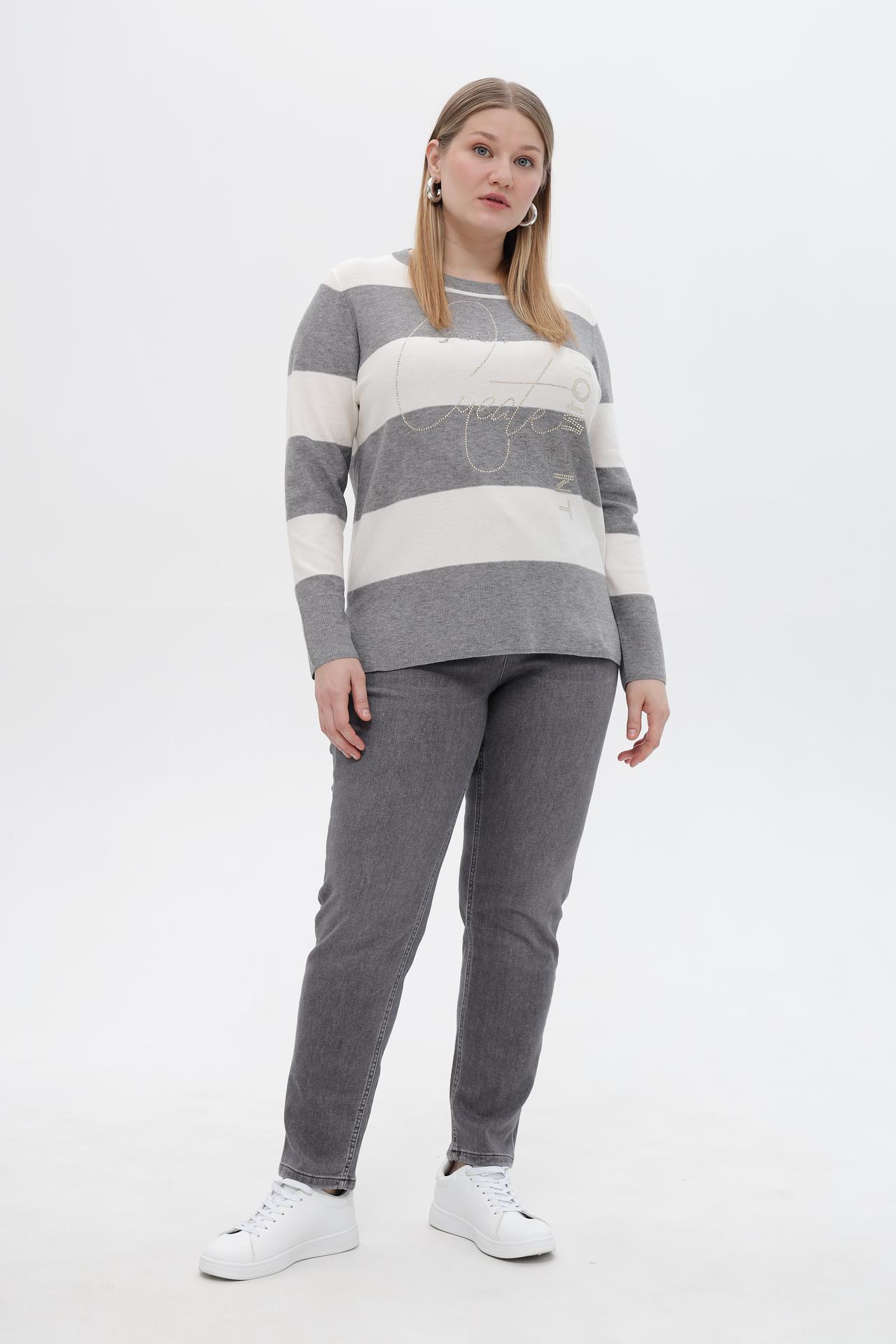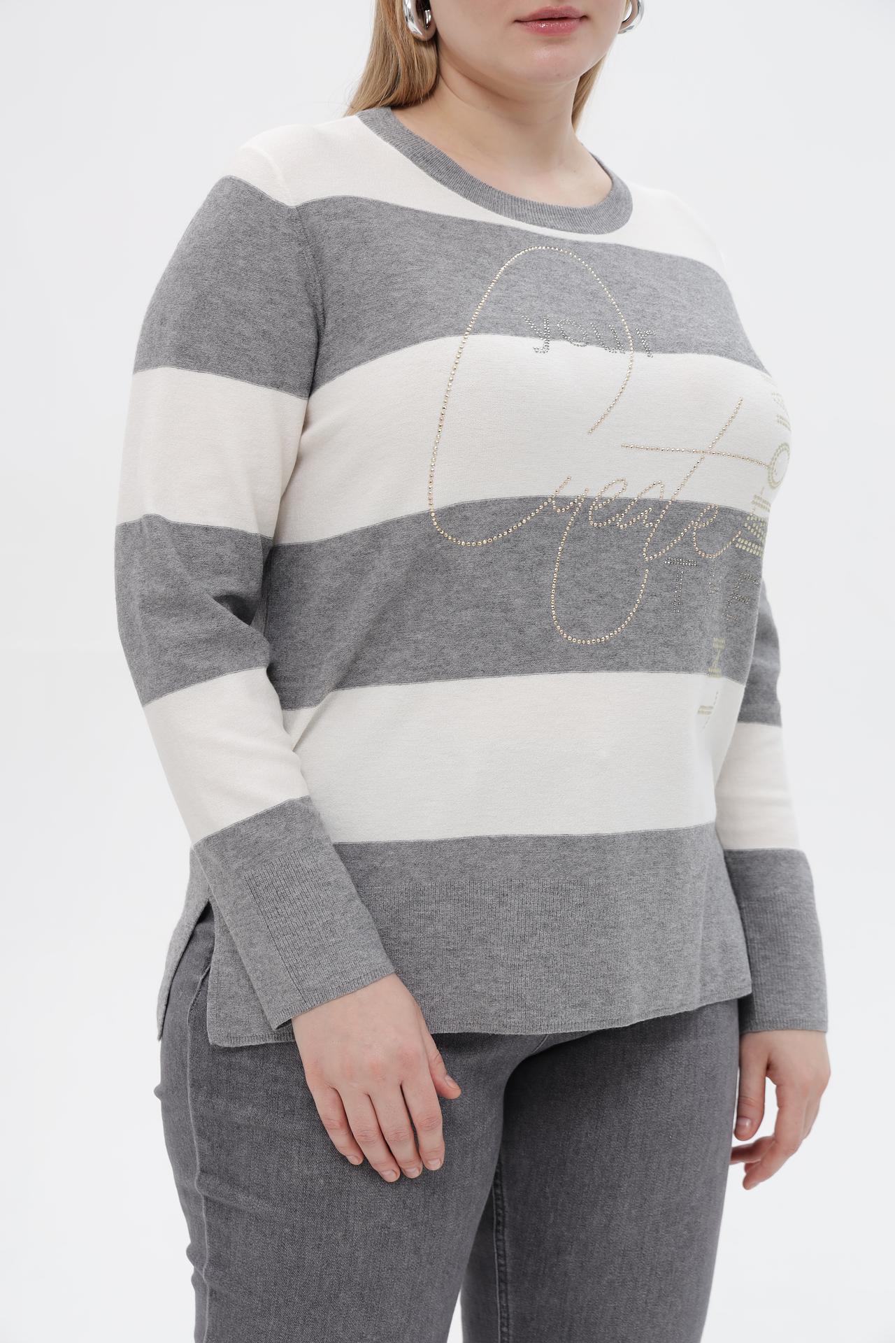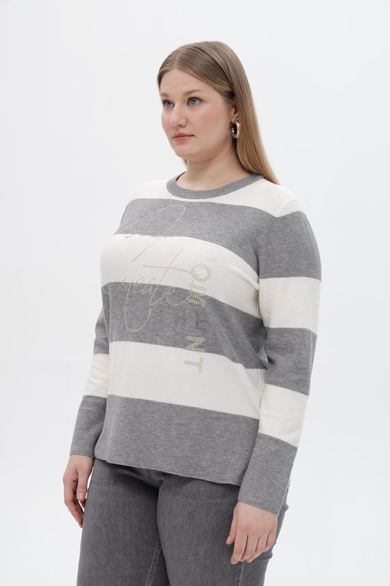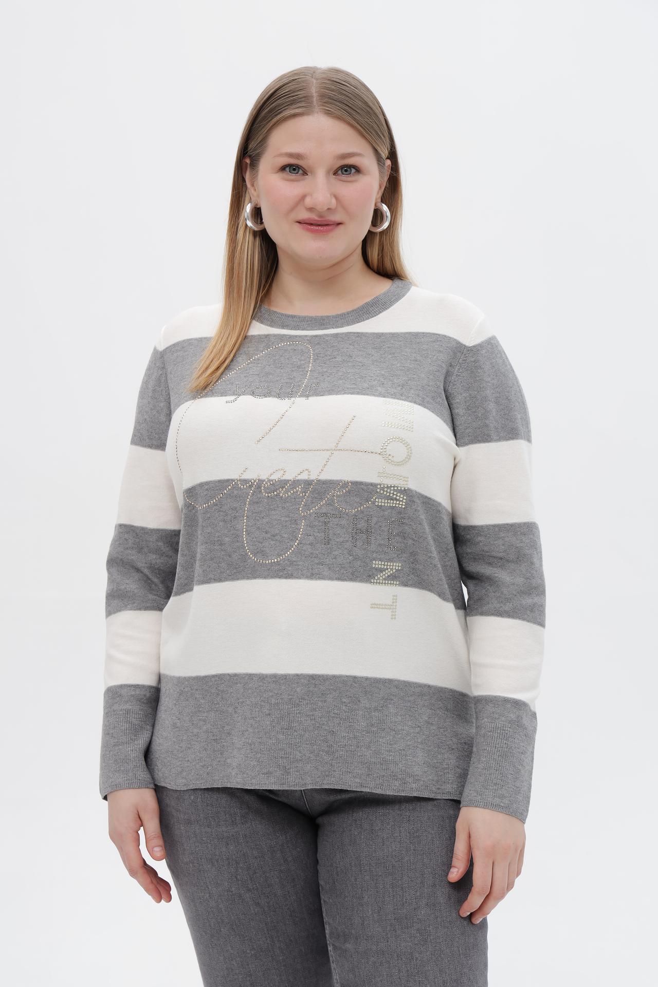 Элегантный пуловер от Rabe collection в классическую полоску станет стильным дополнением вашего гардероба. Модель выполнена в сдержанной цветовой гамме, сочетающей серый и белый оттенки, что делает ее универсальной и легко сочетаемой с различными элементами одежды. Декоративный принт с надписью, украшенный мерцающими стразами, придает изделию изысканность и акцентирует внимание на деталях.