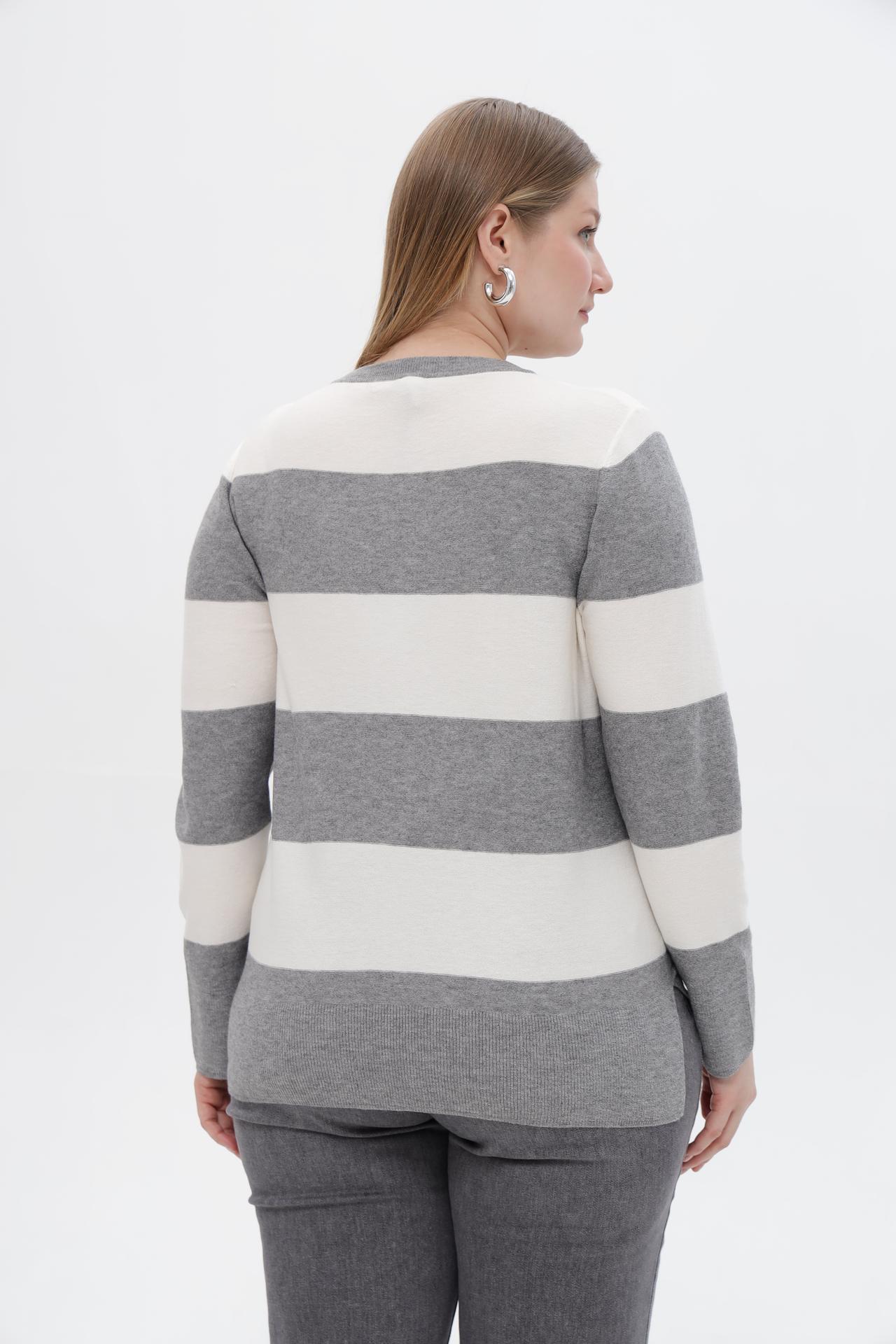 - Дизайн: Классическая модель в горизонтальную полоску с круглым вырезом и длинными рукавами. Оригинальный принт со стразами добавляет изюминку.