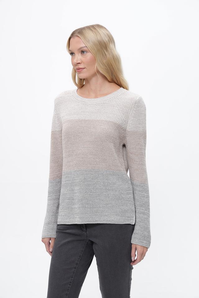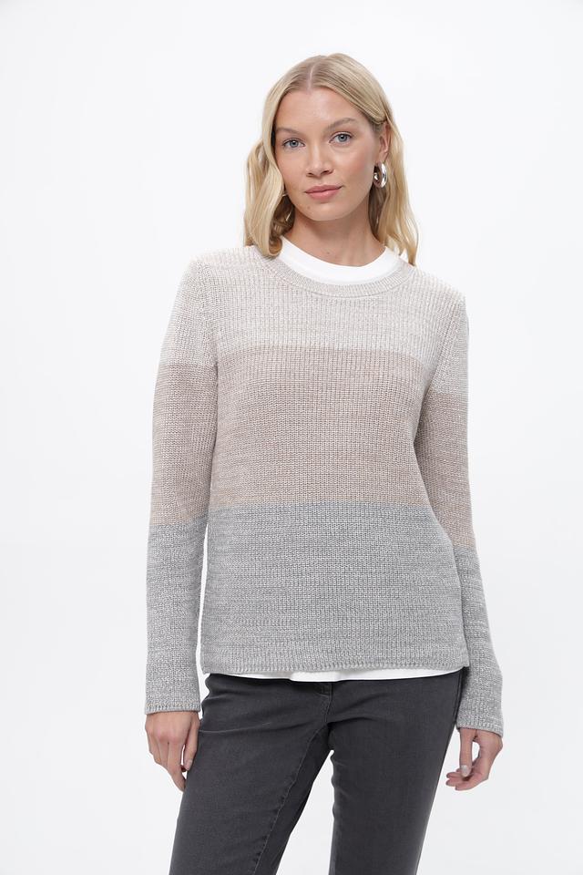 Стильный пуловер Rabe collection серого цвета с длинными рукавами. Изготовлен из мягкого сочетания хлопка и полиакрила с добавлением металлизированной нити, что придает изделию лёгкий блеск. Состав: хлопок 47%, полиакрил 47%, метализ.нить 6%