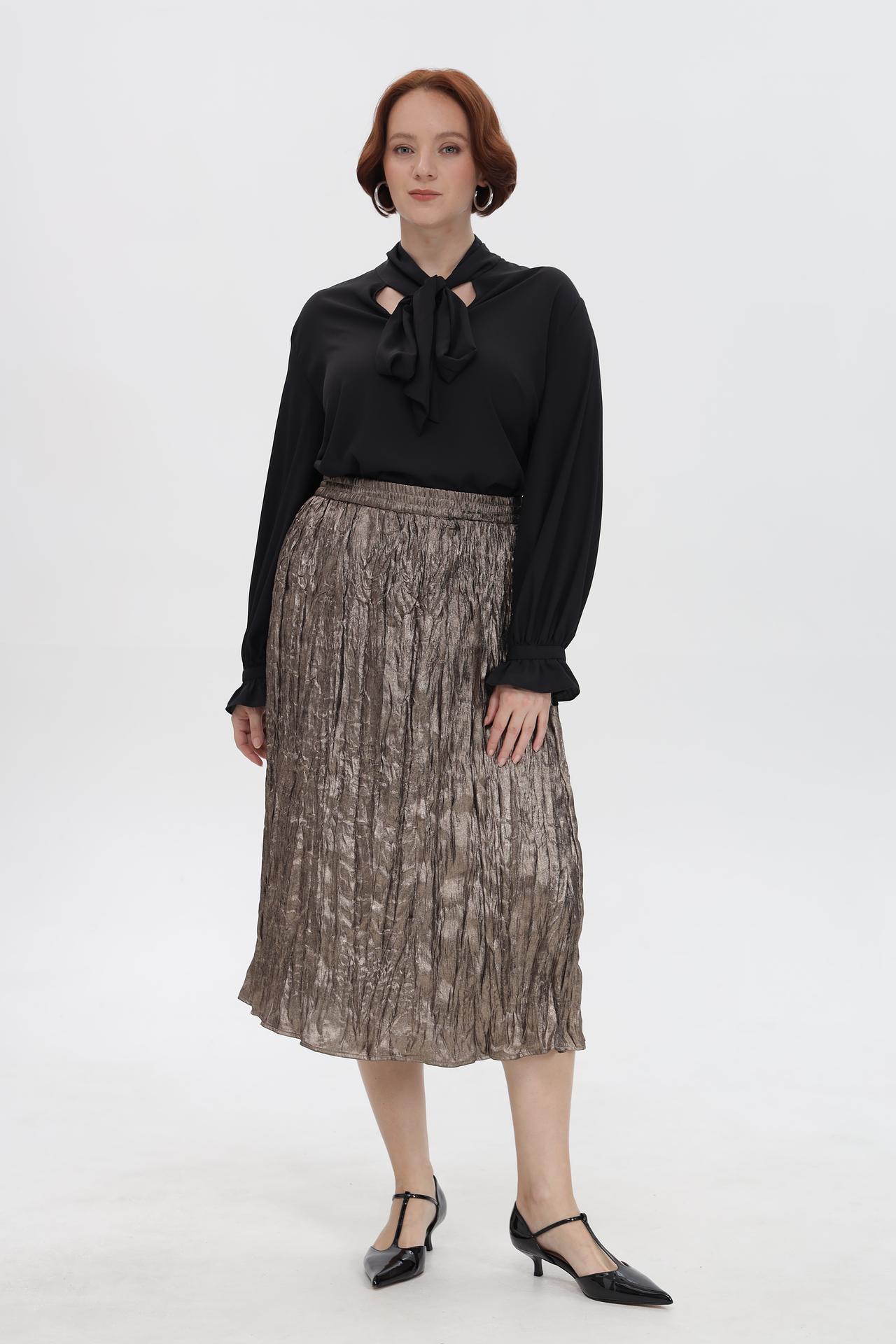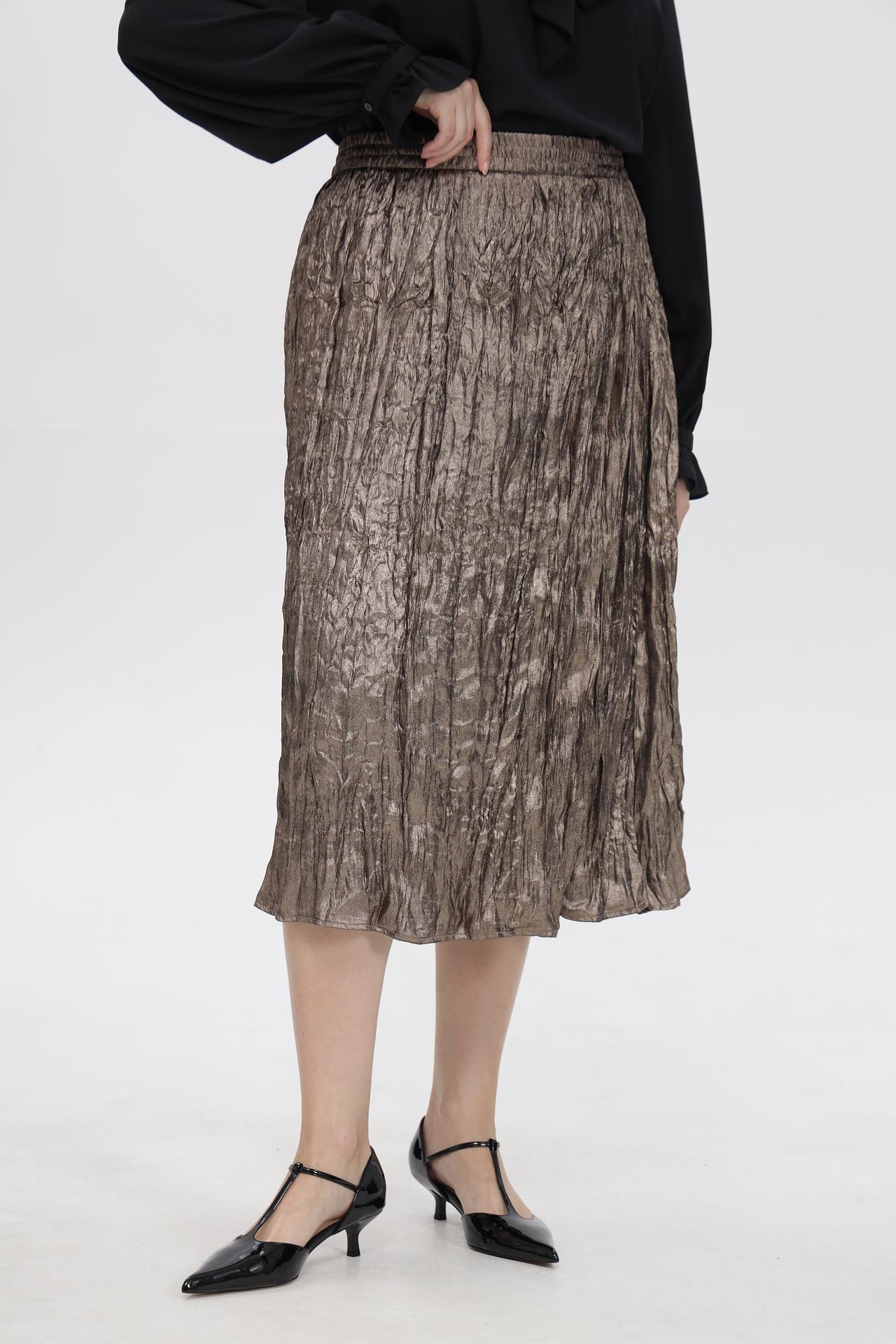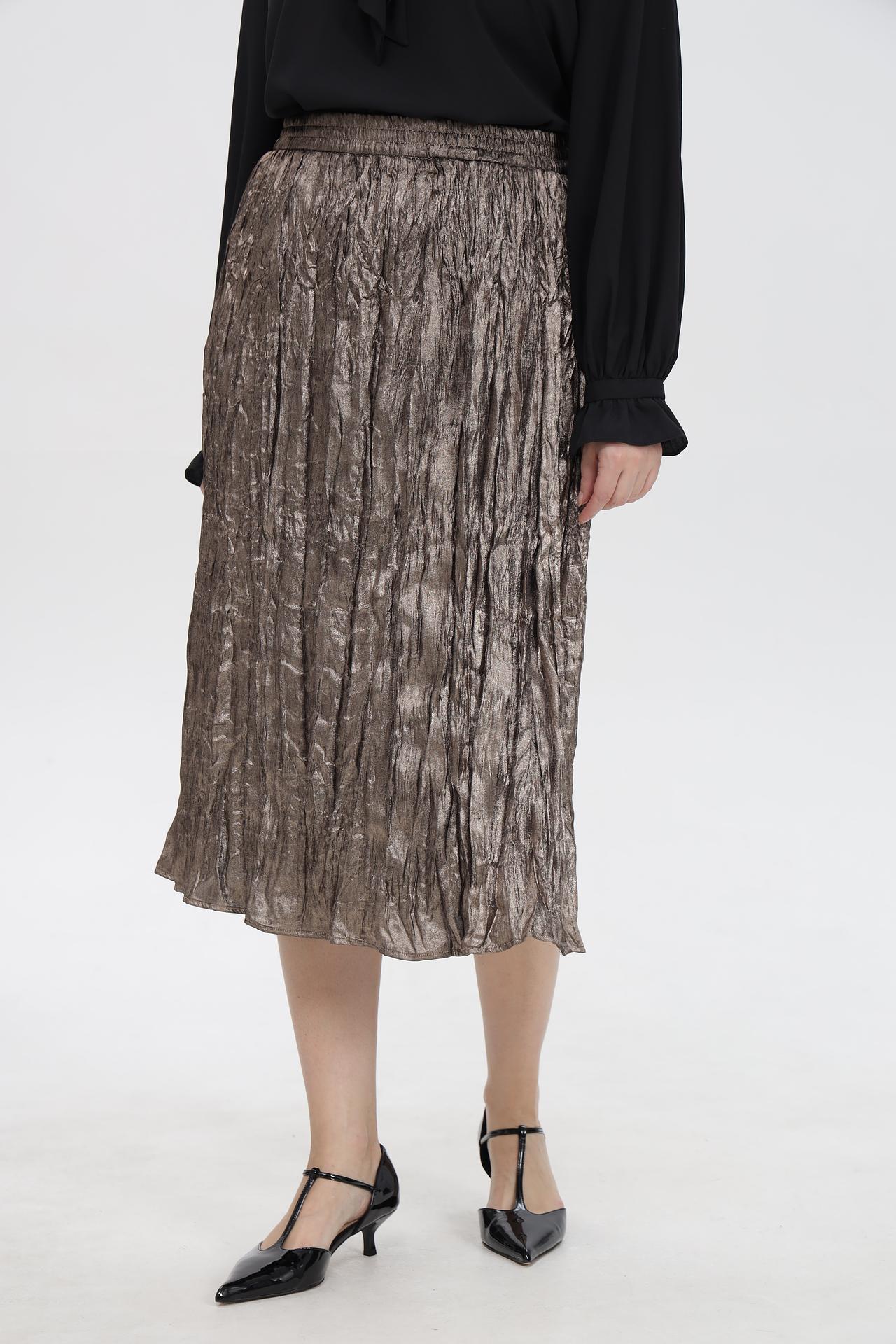 - Дизайн: Плиссированная юбка миди с эластичным поясом, обеспечивающим комфортную посадку. Уникальная жатая текстура ткани придает изделию оригинальность и глубину.