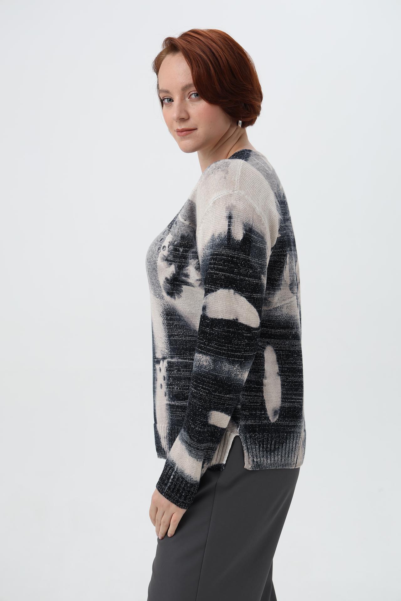 Элегантный пуловер от Rabe collection – идеальный выбор для создания стильных и комфортных образов. Модель выполнена в современном дизайне с эффектным принтом, сочетающим абстрактные элементы и крупные буквы. Деликатное мерцание металлизированной нити придает изделию особую изысканность и привлекательность. Этот пуловер станет ярким акцентом вашего гардероба, подчеркивая вашу индивидуальность.