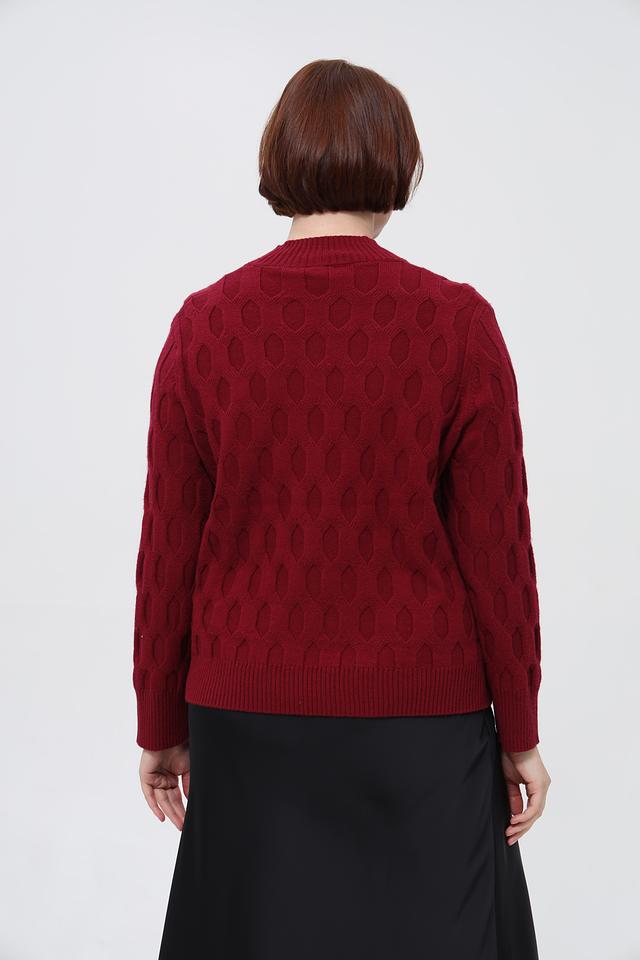 Особое внимание привлекает текстурный узор в виде ромбов, придающий изделию изысканность и оригинальность. Высокий воротник добавляет элегантности образу.