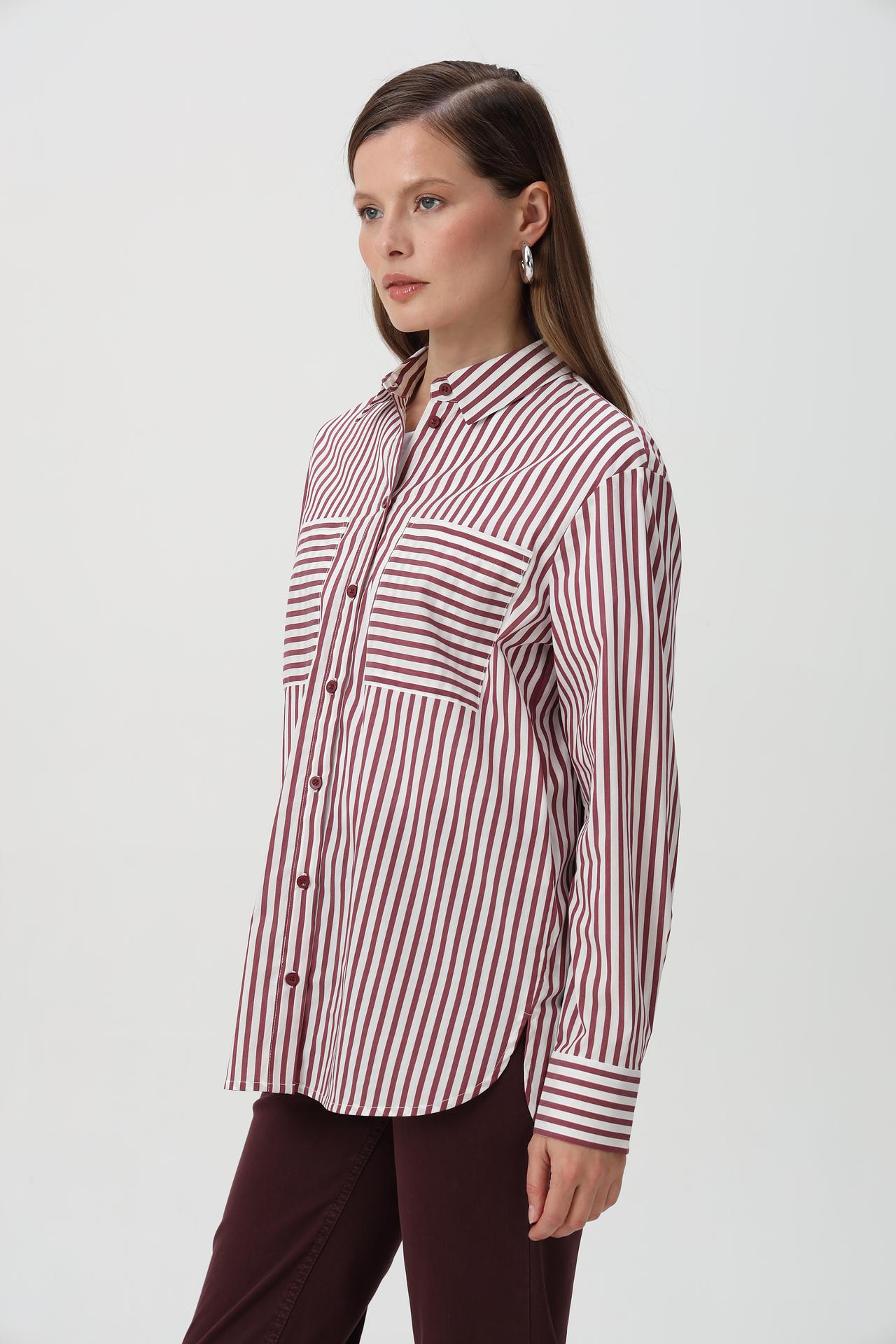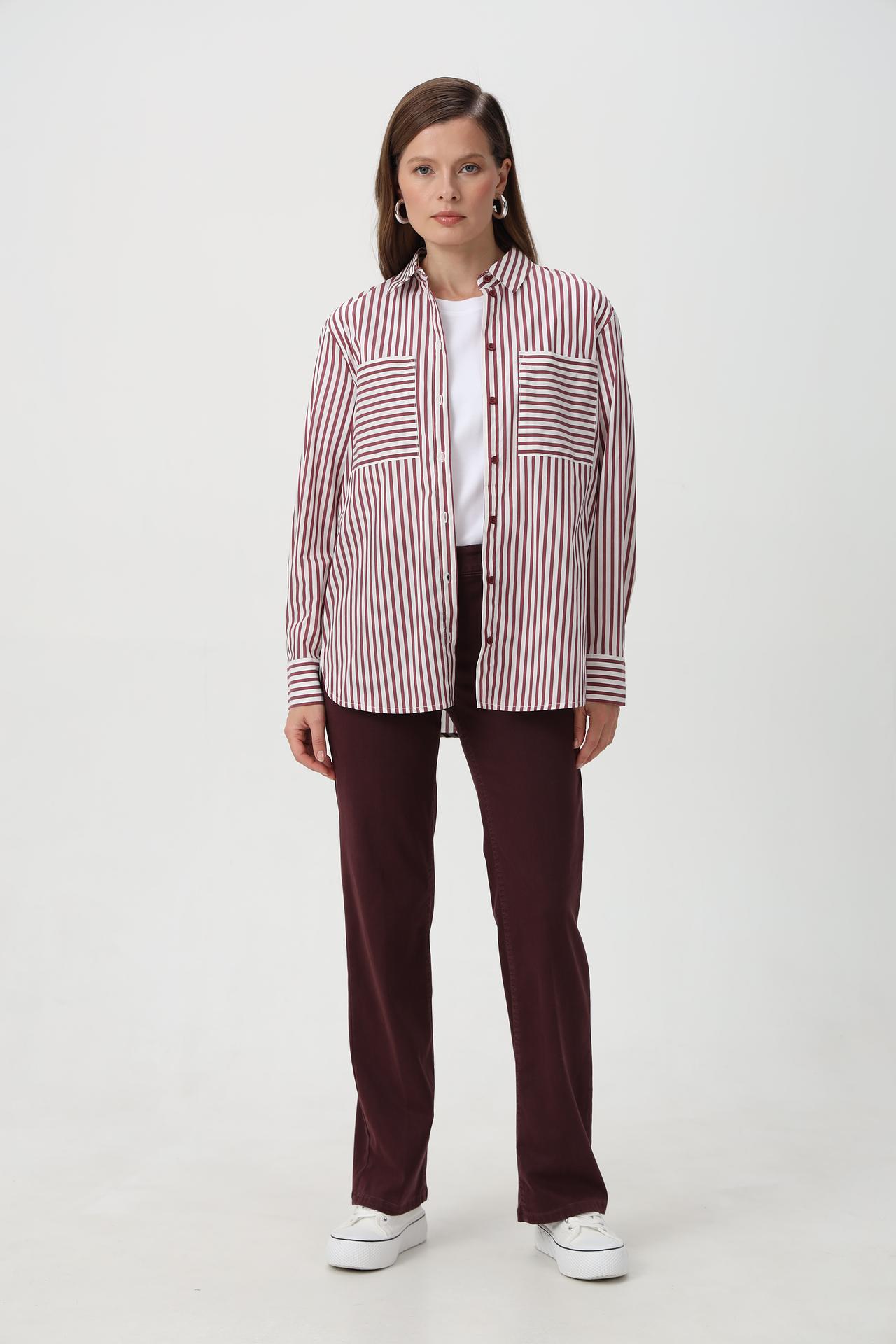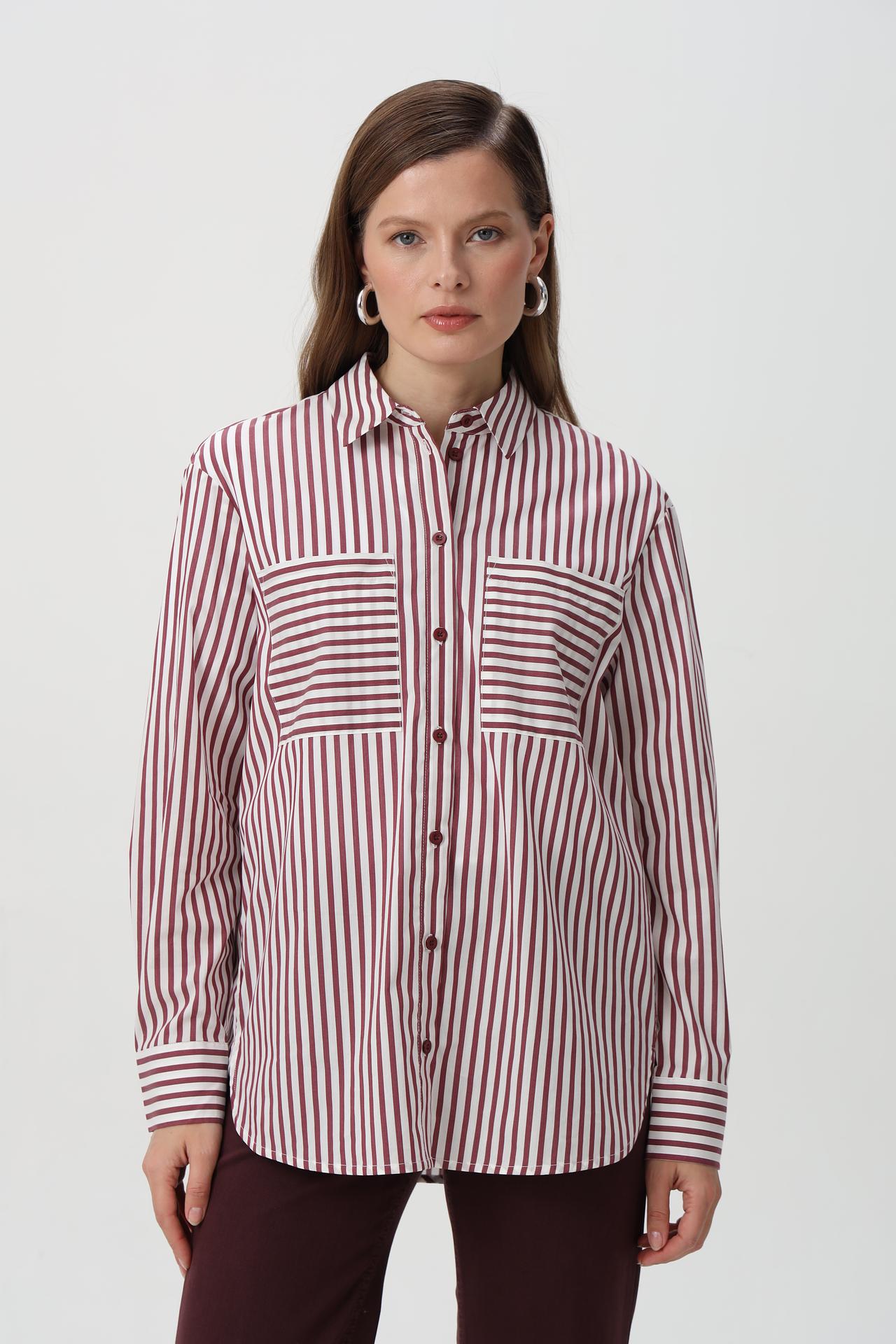 Элегантная блуза от Rabe collection станет прекрасным дополнением вашего гардероба. Классический дизайн в вертикальную бордово-белую полоску визуально стройнит и придает образу изысканность. Модель прямого кроя с двумя накладными нагрудными карманами обеспечивает комфорт и практичность в течение всего дня. Блуза отлично сочетается как с деловыми брюками, так и с джинсами, позволяя создавать разнообразные стильные образы.