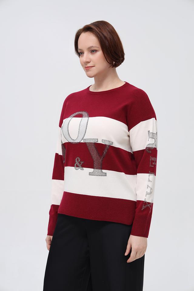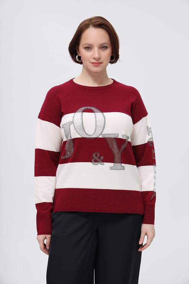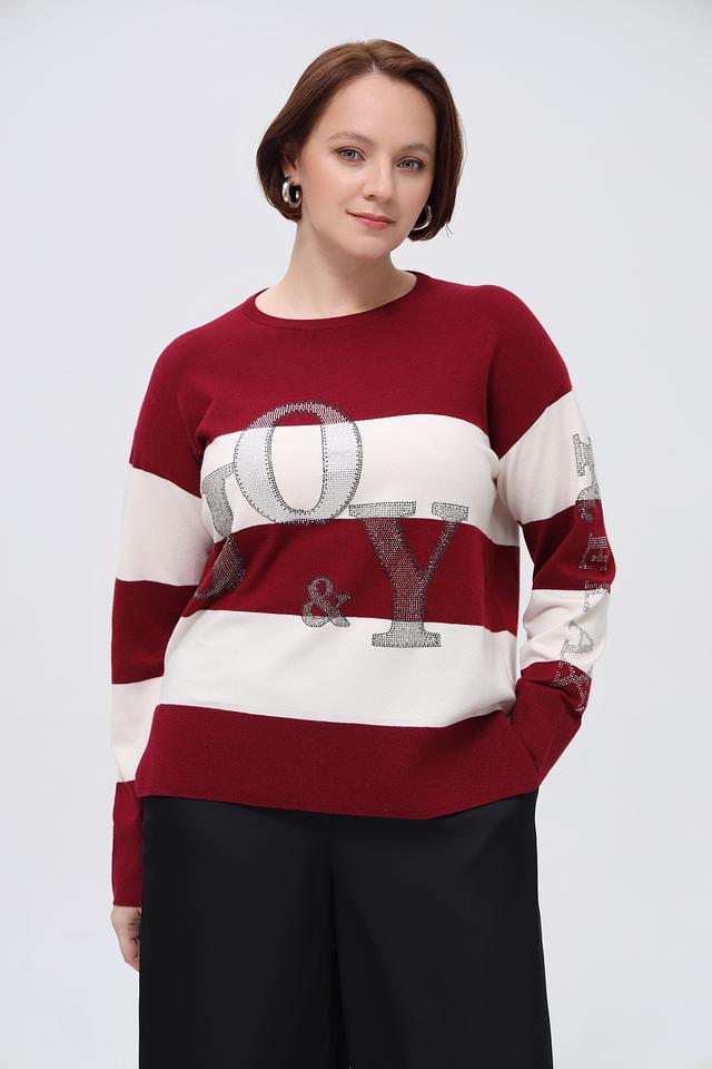 Этот пуловер от Rabe collection выполнен в бордовом цвете с белыми горизонтальными полосками. Модель украшена крупной надписью с буквами, декорированными блестками, что придает ей особый шарм.