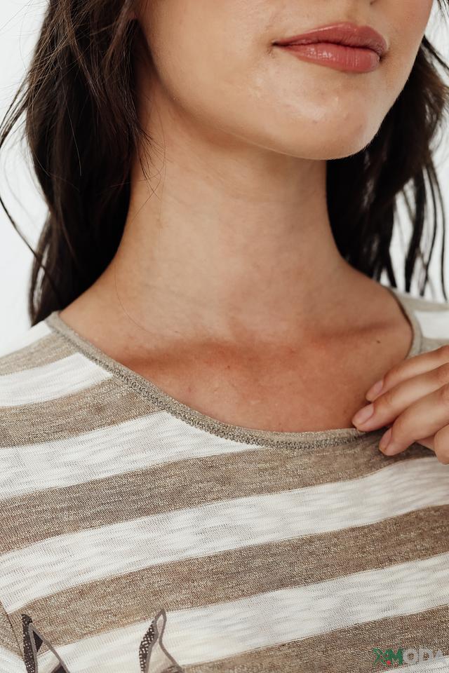 Модель имеет короткие рукава и круглый вырез горловины. Основной цвет пуловера – бежевый, дополненный светлыми полосками. Передняя часть украшена ярким цветочным принтом, который придает изделию индивидуальность и шарм.