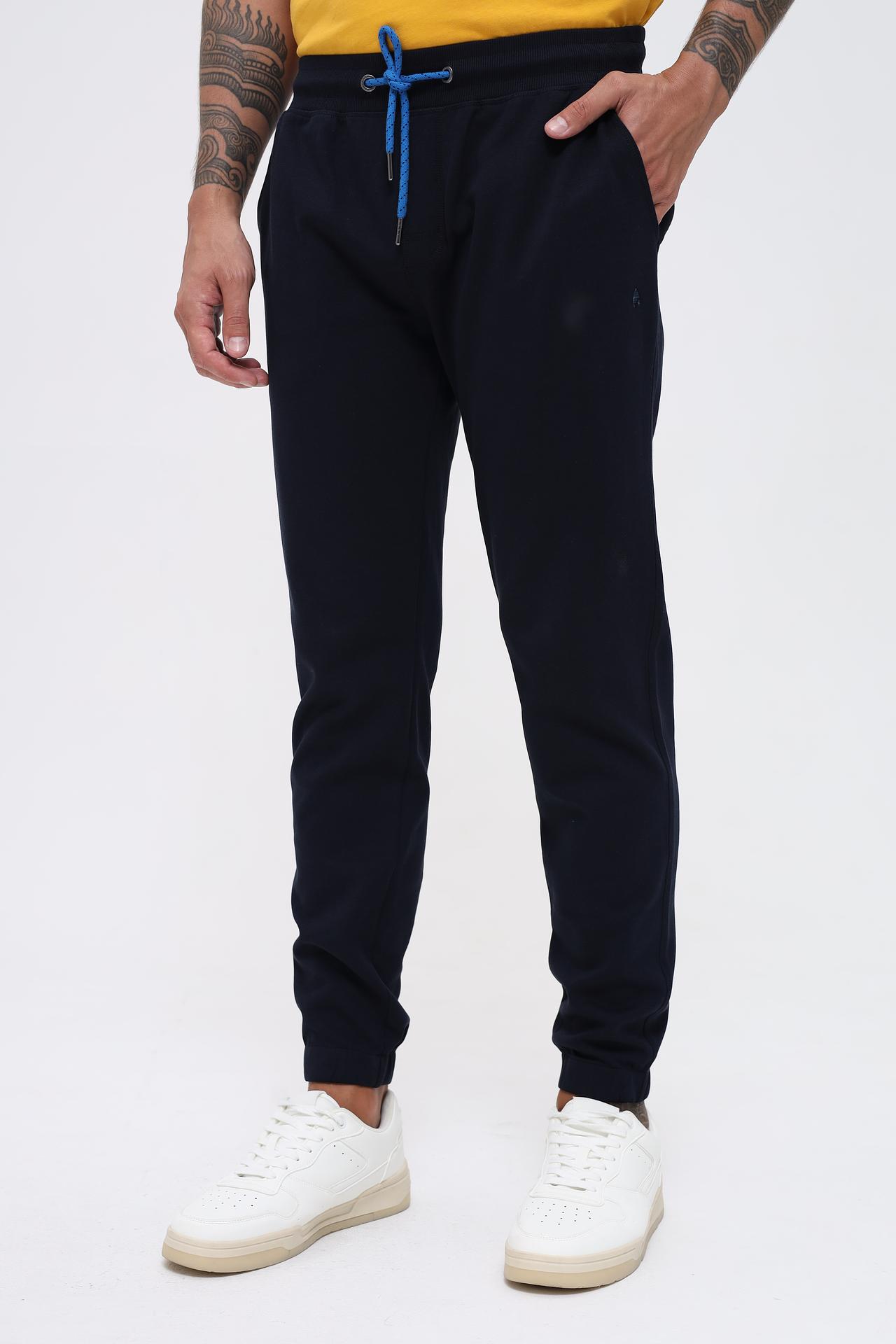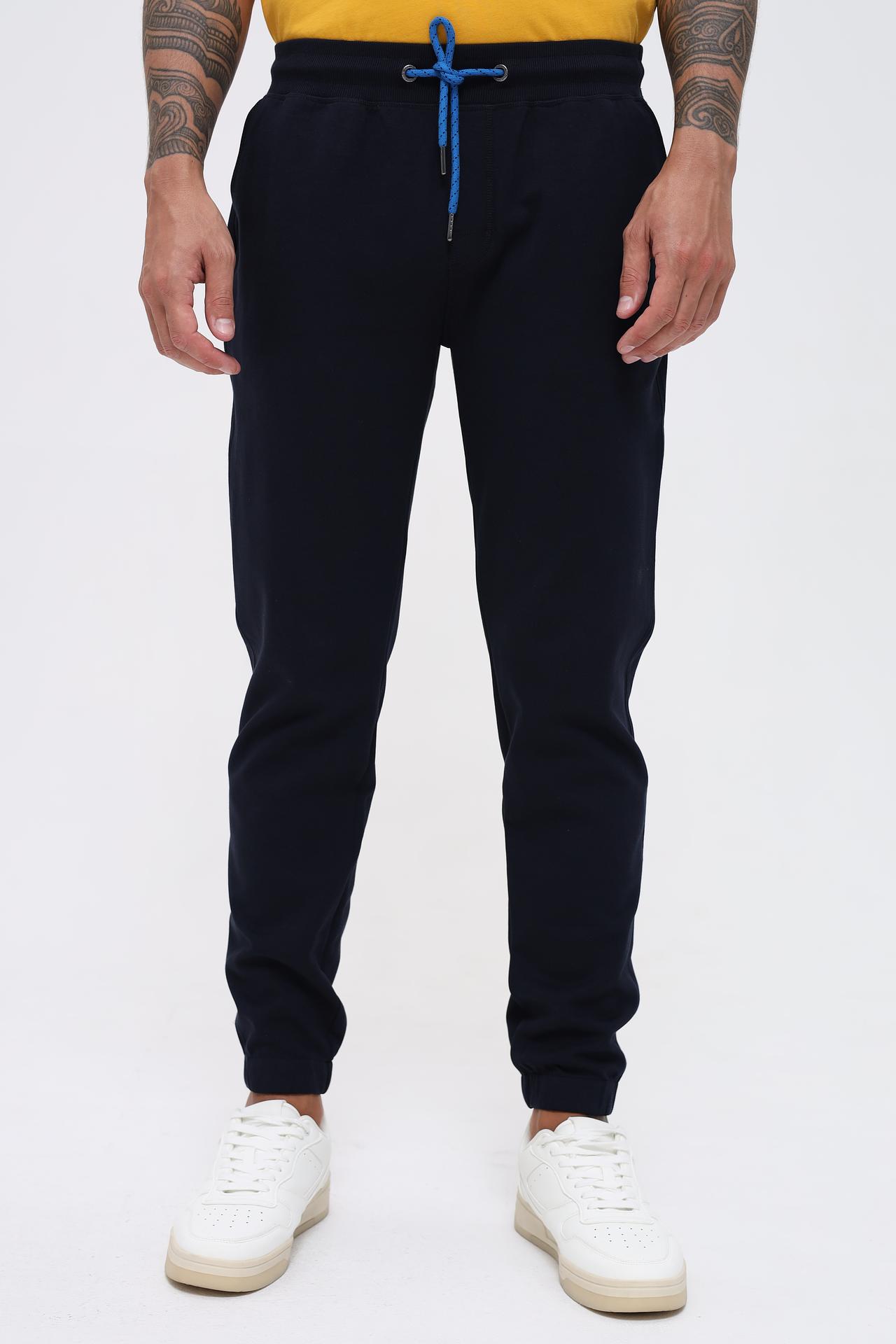 - Современный дизайн: Классический тёмно-синий цвет, зауженный к низу крой и эластичные манжеты на штанинах создают современный силуэт. Контрастные голубые шнурки с вкраплениями добавляют оригинальный акцент.
