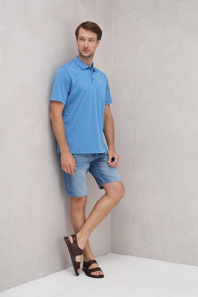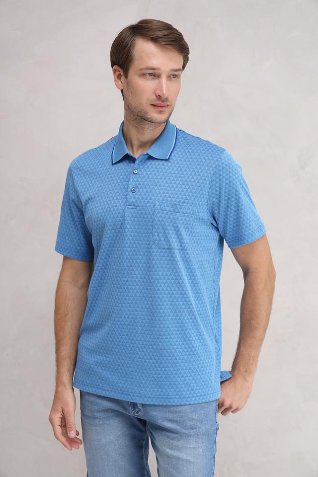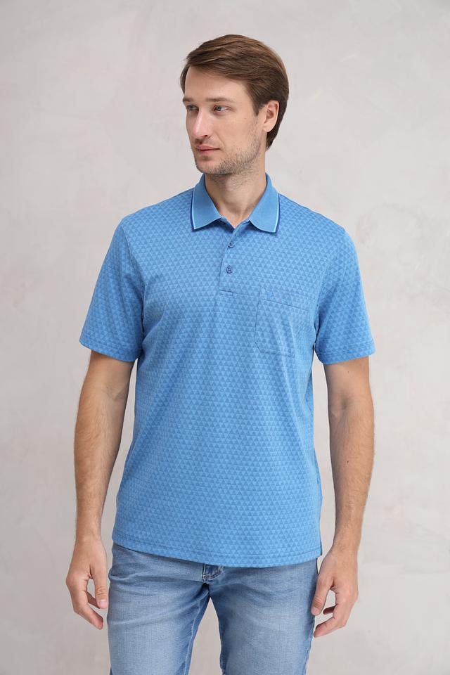 Данная модель выполнена в приятном голубом цвете и украшена геометрическим узором, который придает ей оригинальность. Классический крой поло обеспечивает свободу движений, а воротник и планка с пуговицами выполнены в контрастном цвете – светло-голубом, что добавляет акцент.