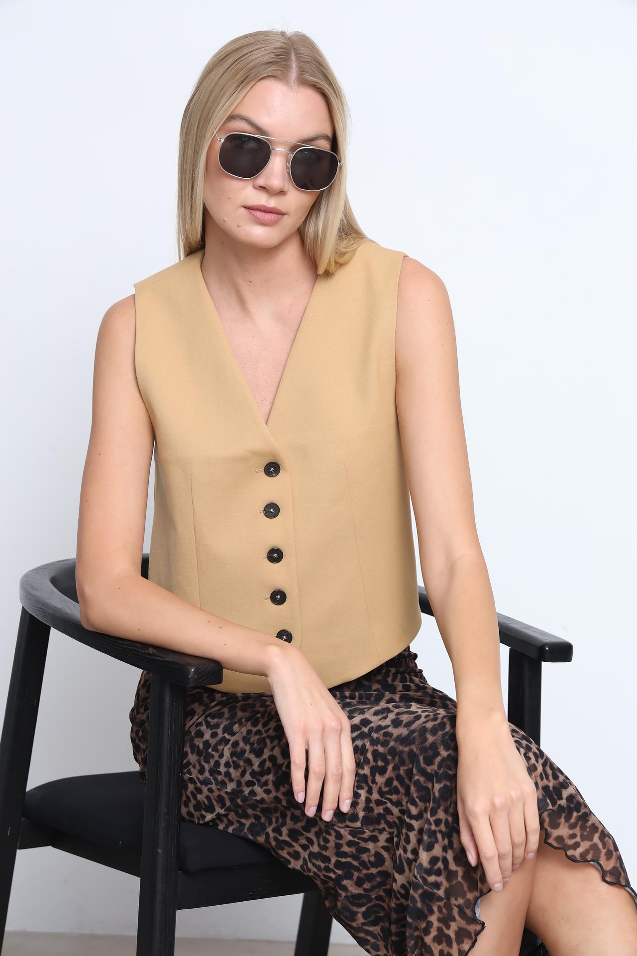 - Элегантный дизайн: Классический крой с глубоким V-образным вырезом и рядом акцентных темных пуговиц придает жилету утонченный и завершенный вид. Укороченная длина и приталенный силуэт выгодно подчеркивают фигуру.