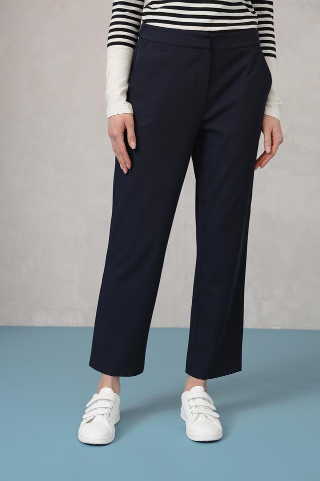 Брюки имеют стандартную посадку, прямой крой и длину до щиколотки, что делает их актуальными и современными. Застежка на молнию и пуговицу обеспечивает надежную фиксацию. Модель дополнена функциональными карманами по бокам.