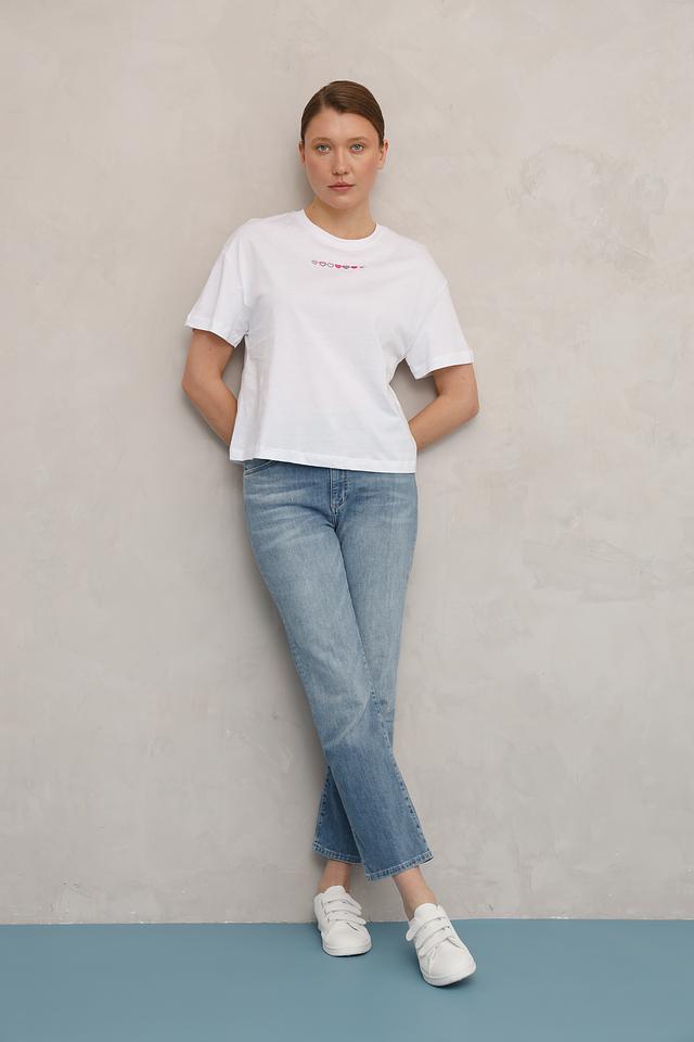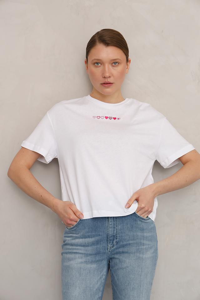 Особенностью данной модели является нежный принт в виде ряда розовых сердечек, расположенных на груди. Этот деликатный декор придает футболке романтичное и женственное настроение.