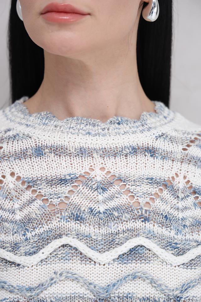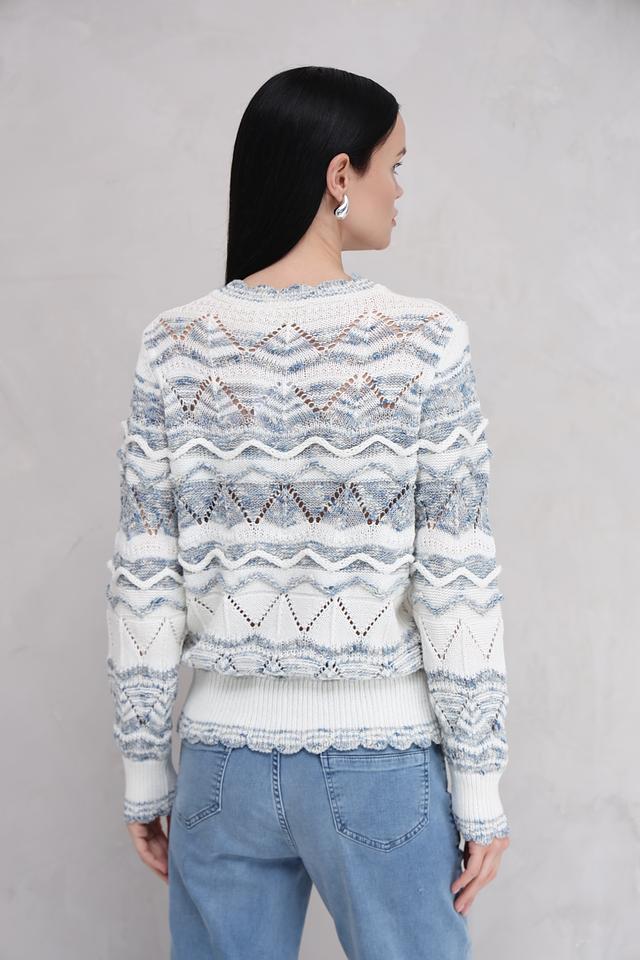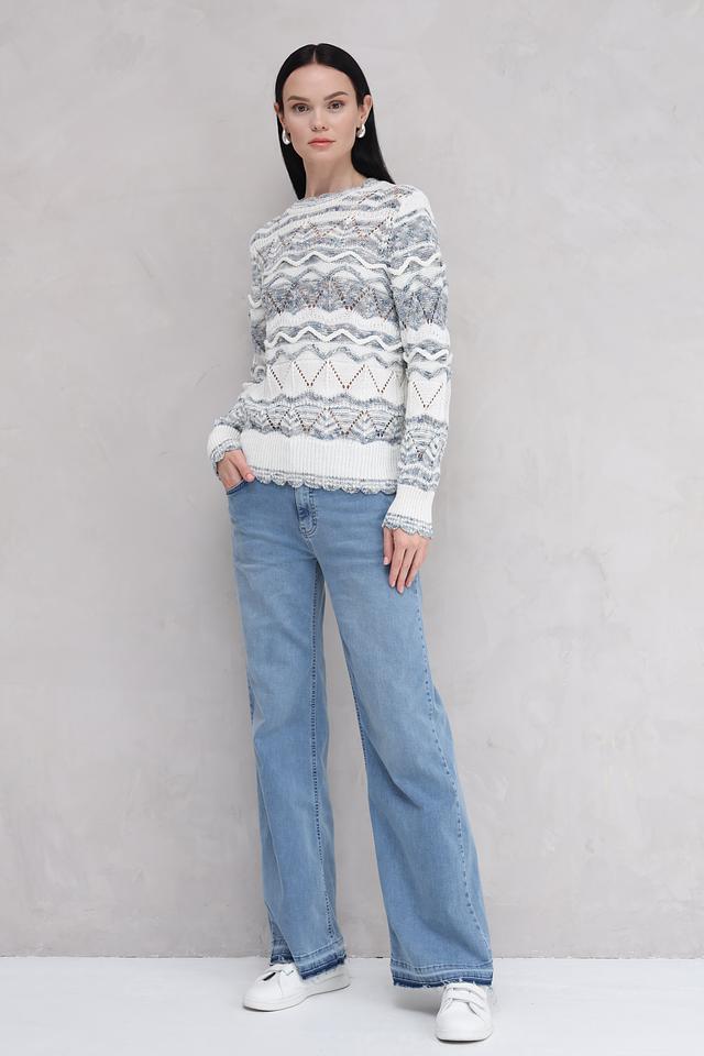 Пуловер имеет светло-голубую основу, украшенную сложным жаккардовым узором в белых и голубых тонах. Круглый вырез горловины и слегка расширенный силуэт делают его универсальным для различных образов.