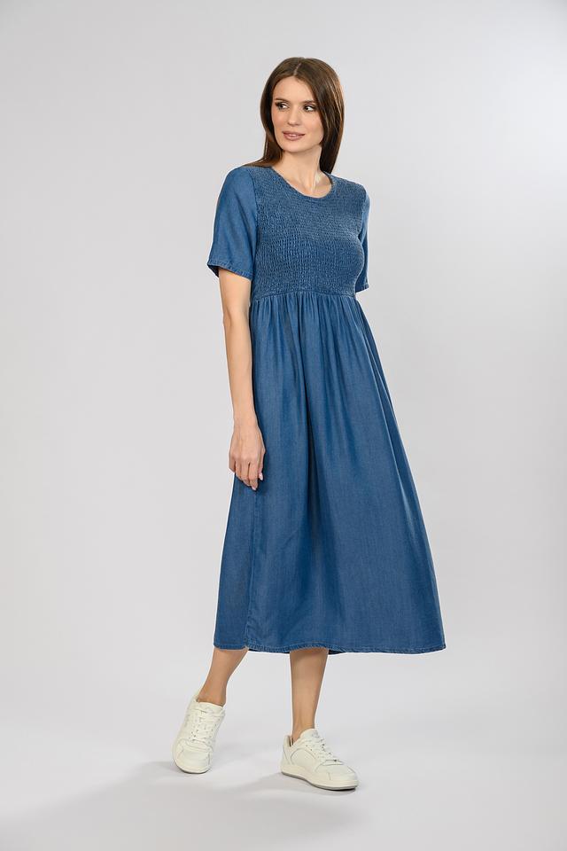 Особенностью модели является сборка на груди, которая создает красивую драпировку и акцентирует внимание на верхней части тела. Круглый вырез горловины и короткие рукава делают платье легким и воздушным.