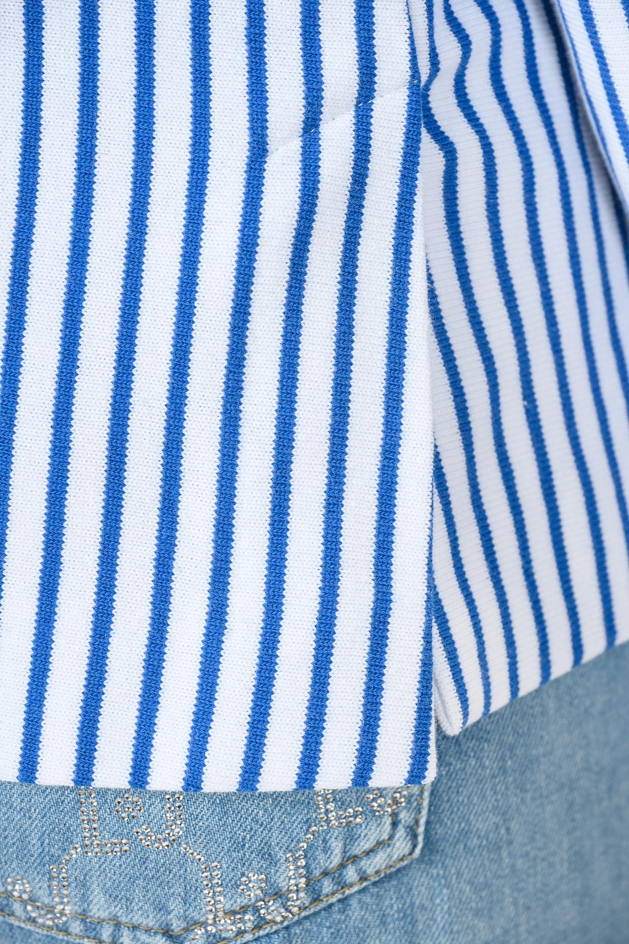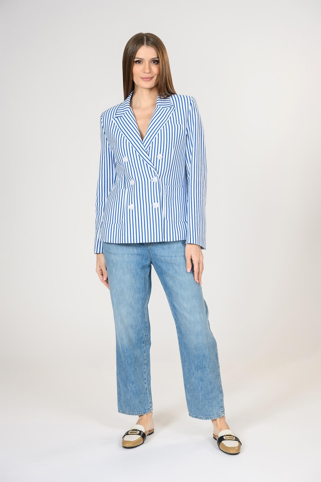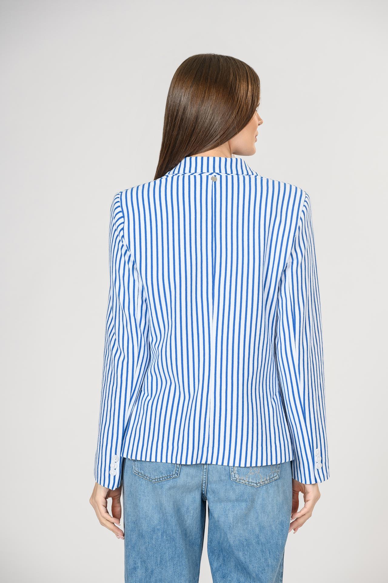 - Классический дизайн: Полосатый принт и двубортный крой делают жакет актуальным вне времени.