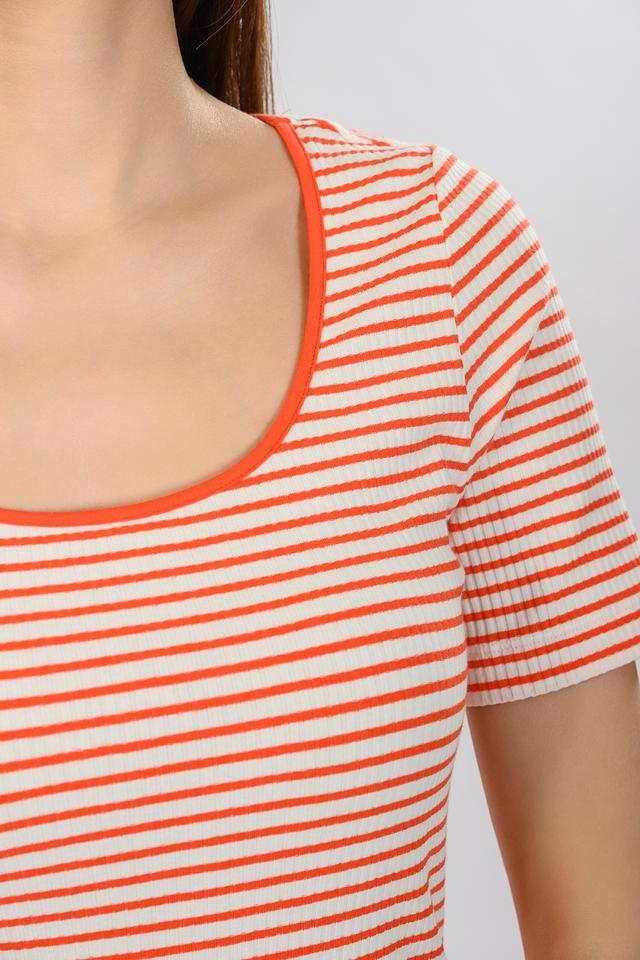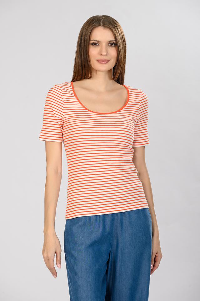 Модель имеет классический крой с короткими рукавами и круглым вырезом горловины. Особенностью данной футболки является яркий оранжево-белый полосатый принт, который добавит вашему образу свежести и динамики.