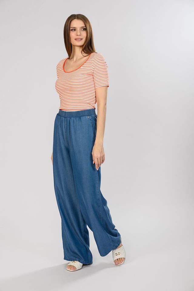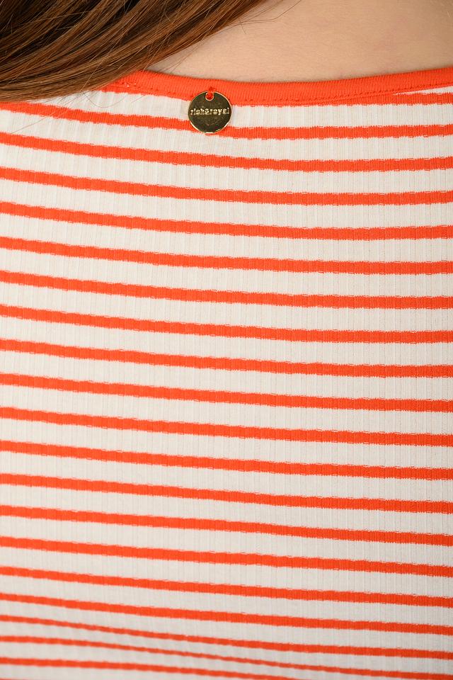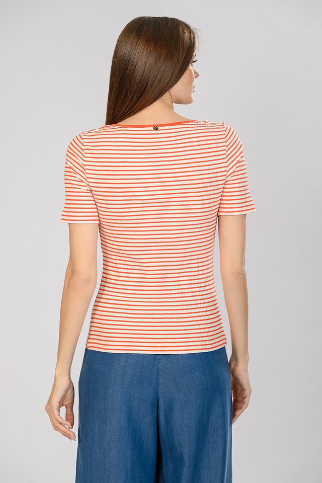 Женская футболка Rich and Royal оранжево-белого цвета с коротким рукавом и круглым вырезом. Изготовлена из мягкого хлопка с добавлением эластана для комфортной посадки. Стильная полоска придает образу свежесть и легкость. Состав: хлопок 95%, эластан 5%