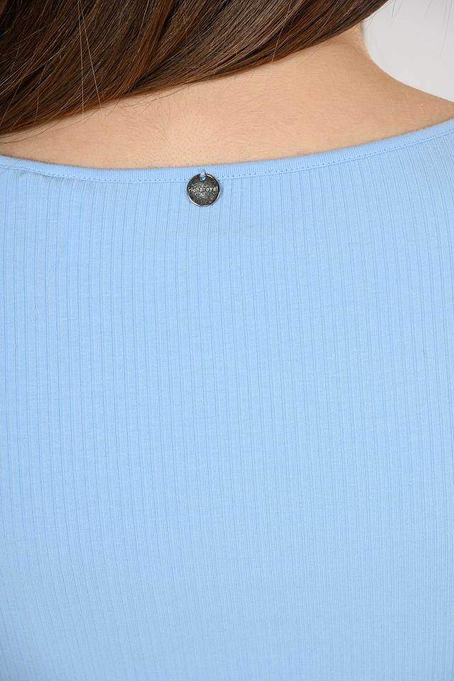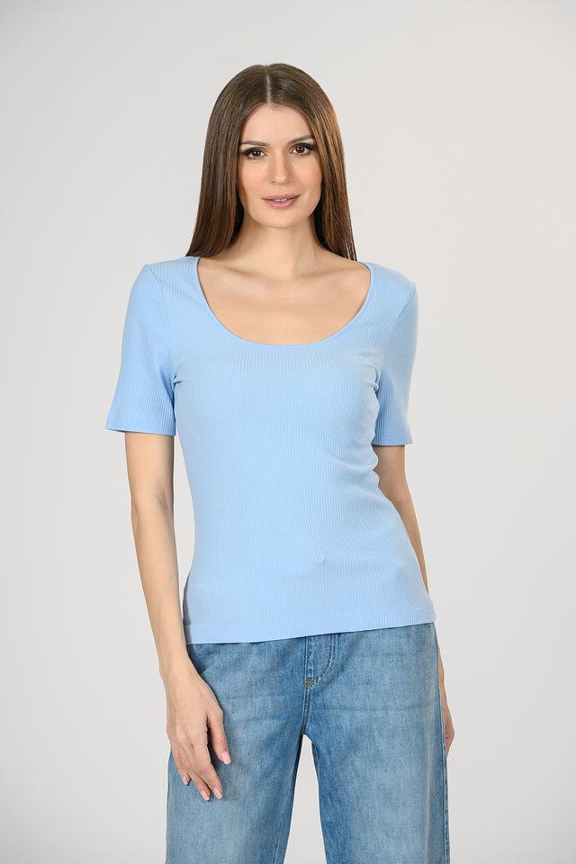 Женская футболка Rich and Royal голубого цвета выполнена из приятного в носке трикотажа в рубчик. Приталенный силуэт и округлый вырез горловины подчеркивают фигуру, а эластан в составе обеспечивает комфортную посадку. Состав: хлопок 95%, эластан 5%