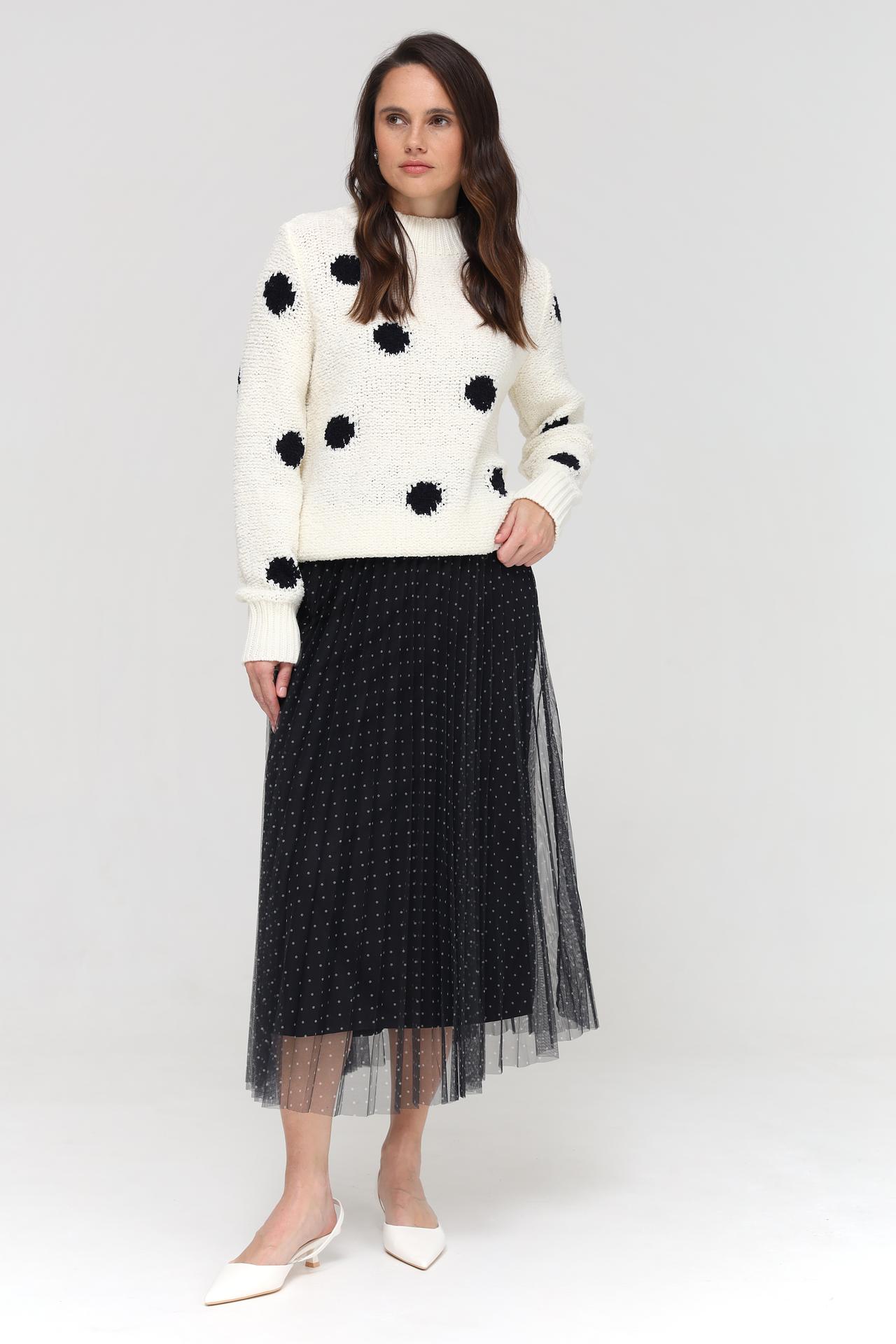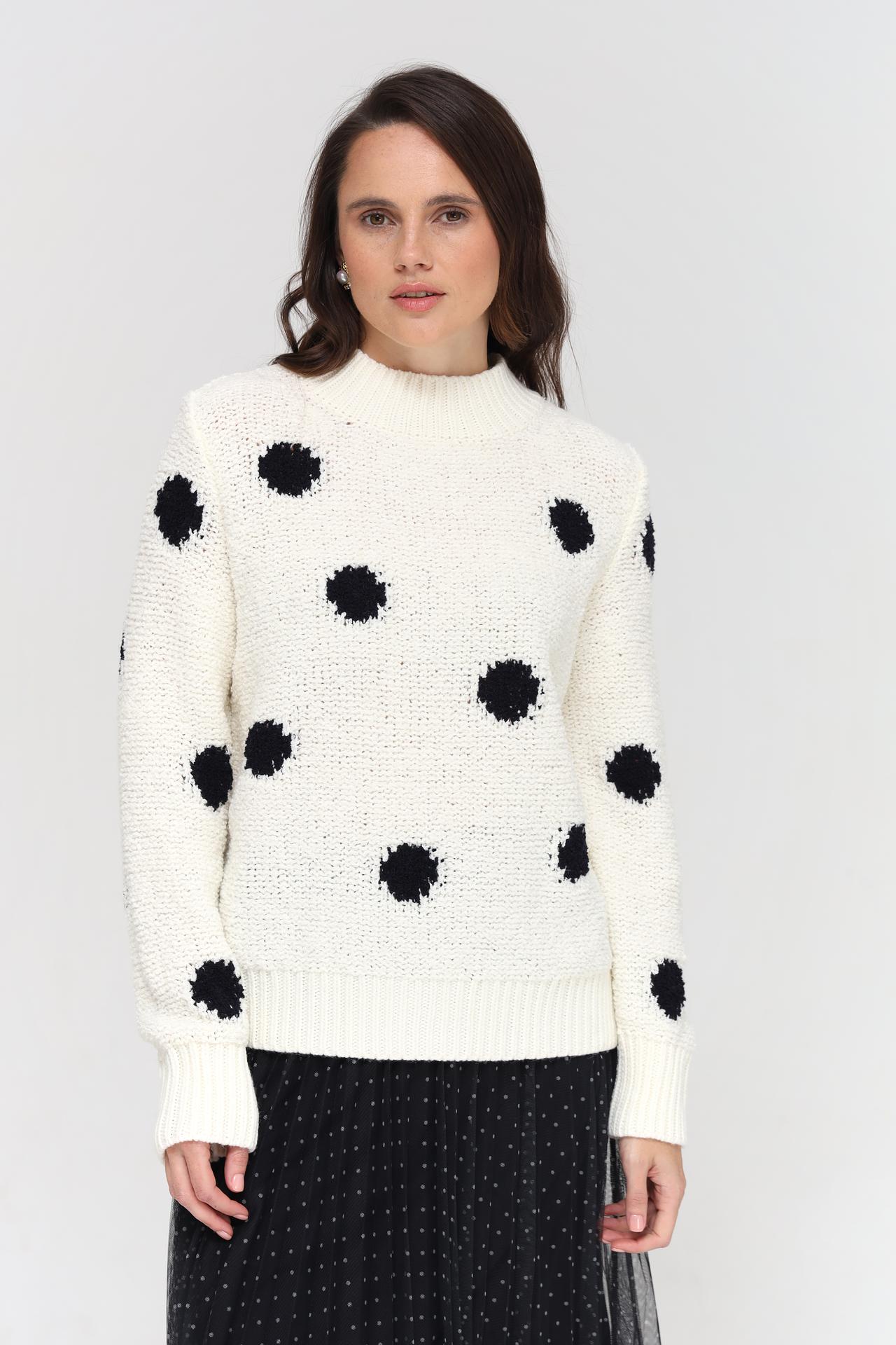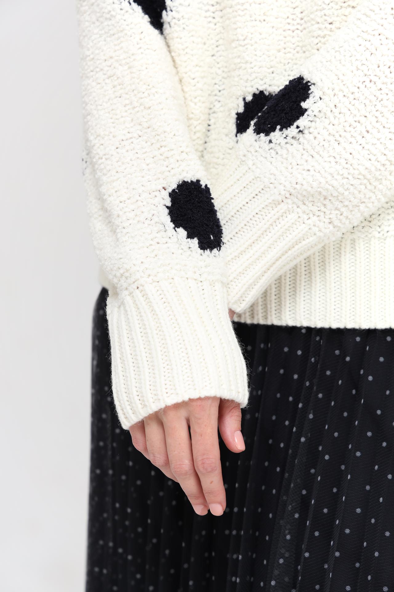 - Дизайн в горошек. Эффектный принт в виде крупных черных точек на белом фоне придает изделию игривый и стильный вид. Это делает свитер заметным акцентом в любом образе.