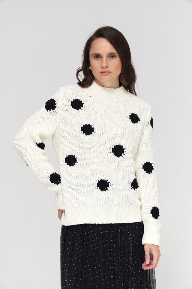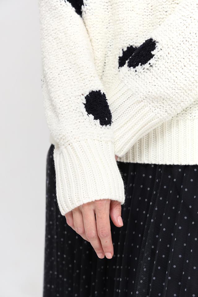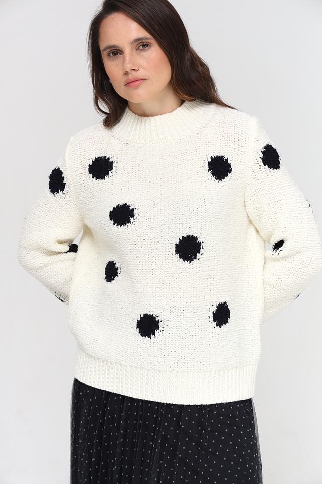 Этот пуловер от Rich and Royal станет отличным дополнением к вашему гардеробу. Он выполнен в белом цвете и украшен крупным чёрным горошком, что придает ему игривый и запоминающийся вид.