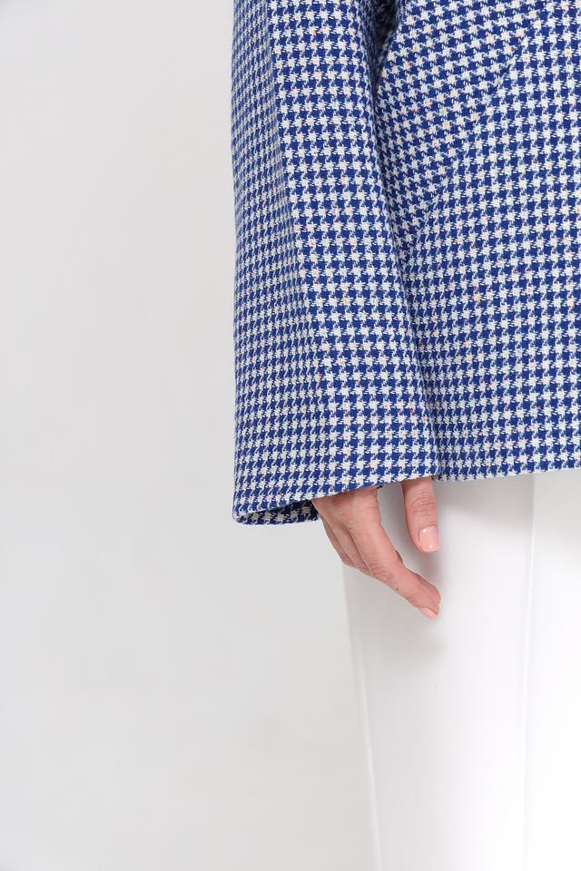 Куртка имеет двубортную застежку на крупные пуговицы, что подчеркивает ее элегантный стиль. Прямой крой обеспечивает комфортную посадку по фигуре, а слегка заниженная линия плеч создает современный силуэт.