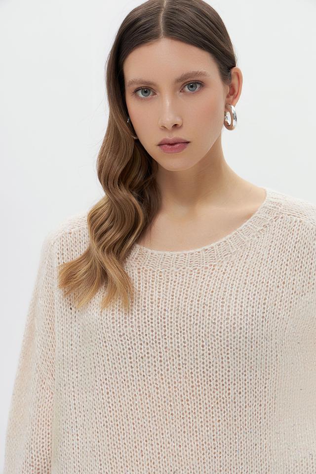 Модель имеет свободный крой, который обеспечивает комфорт и свободу движений. Округлый вырез горловины и рукава реглан придают пуловеру классический и универсальный вид. Бежевый цвет изделия легко сочетается с различными элементами одежды.