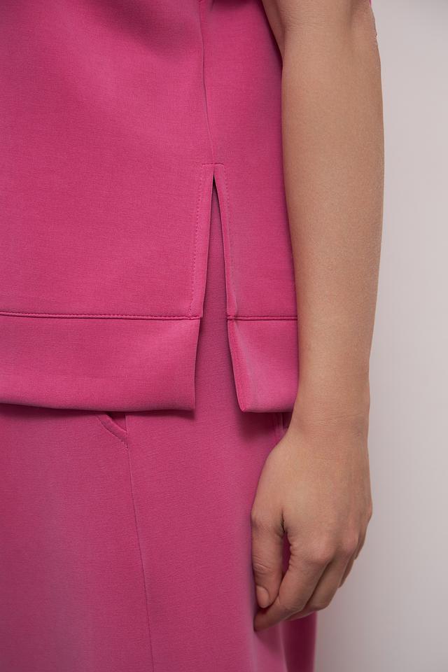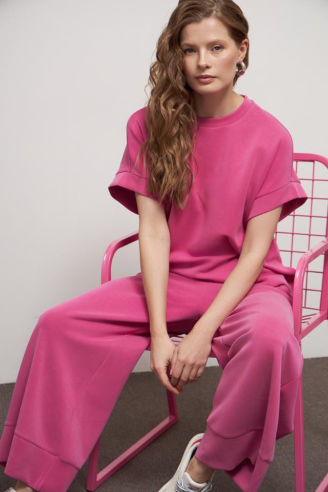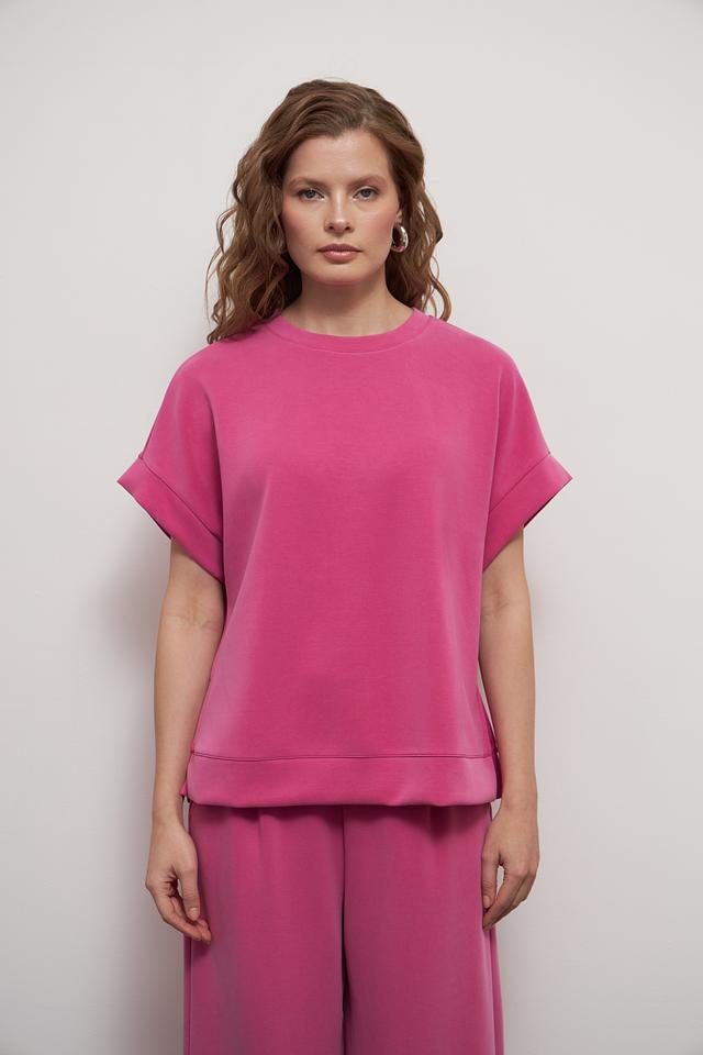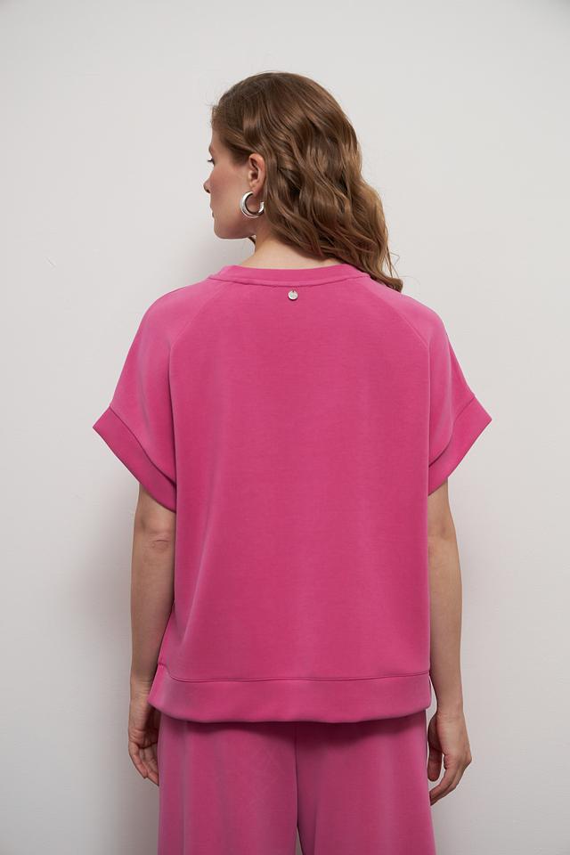 Женский пуловер Rich and Royal фуксиевого цвета – это стильная и комфортная модель с коротким рукавом и округлым вырезом. Изготовлен из мягкого и приятного к телу материала, идеально подходит для создания повседневных образов. Состав: модал 52%, полиэстер 42%, эластан 6%