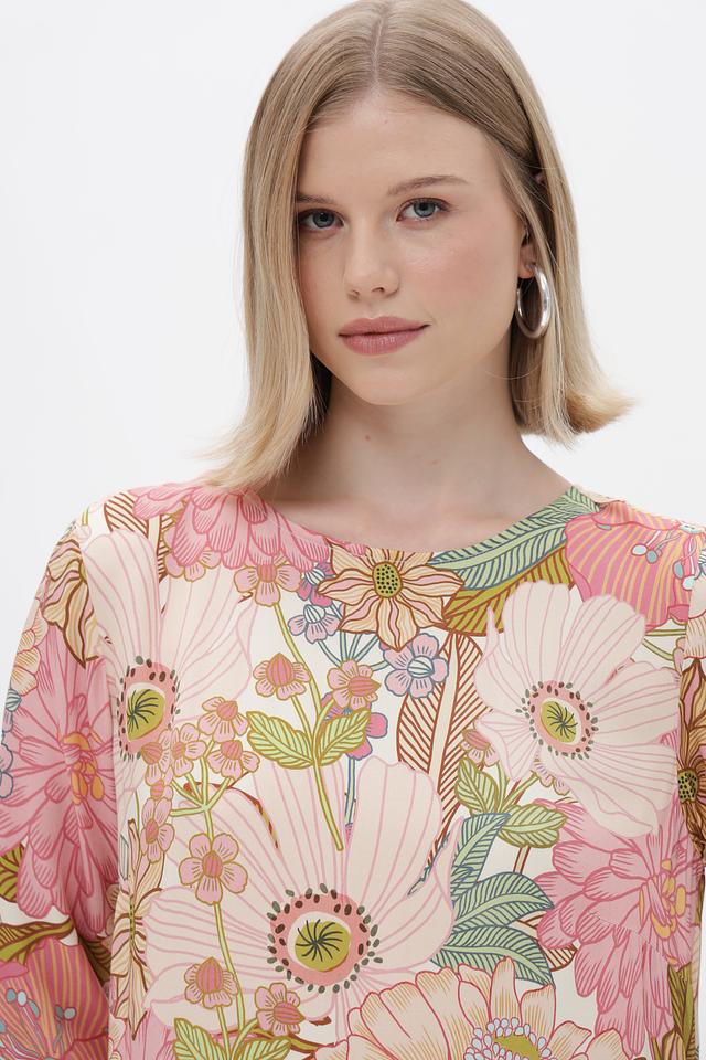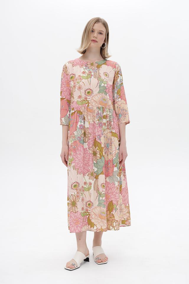 Основной цвет платья – нежно-розовый, который служит прекрасным фоном для яркого и красочного цветочного принта. Принт включает в себя различные оттенки розового, оранжевого, зеленого и голубого, создавая эффектный и запоминающийся образ.