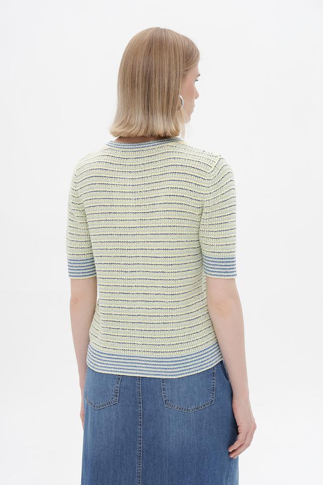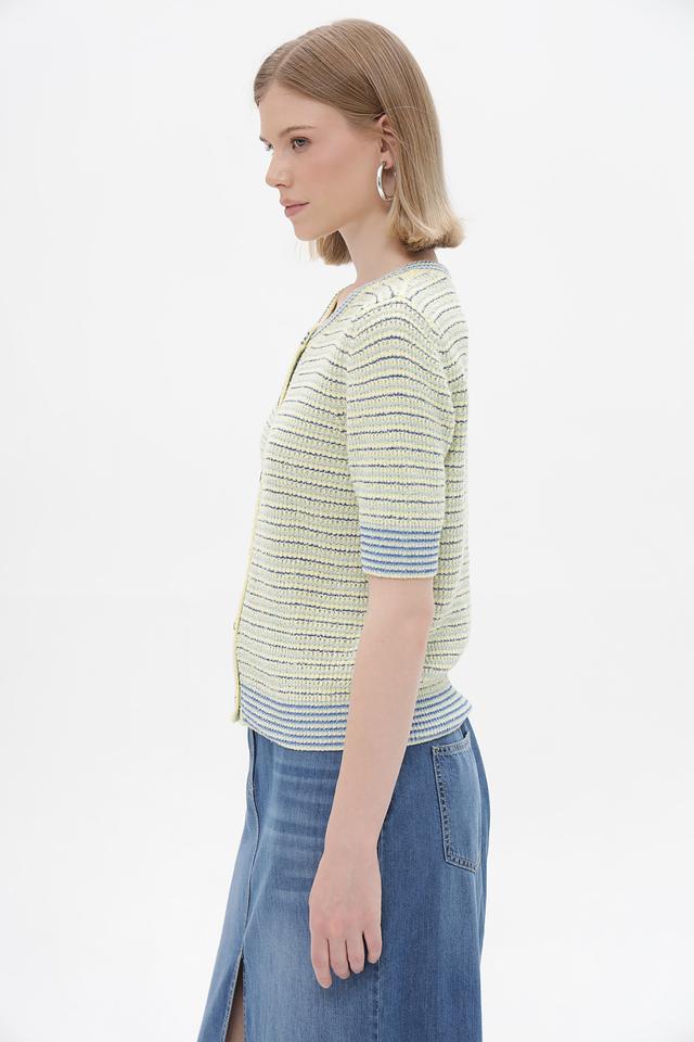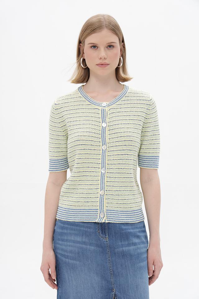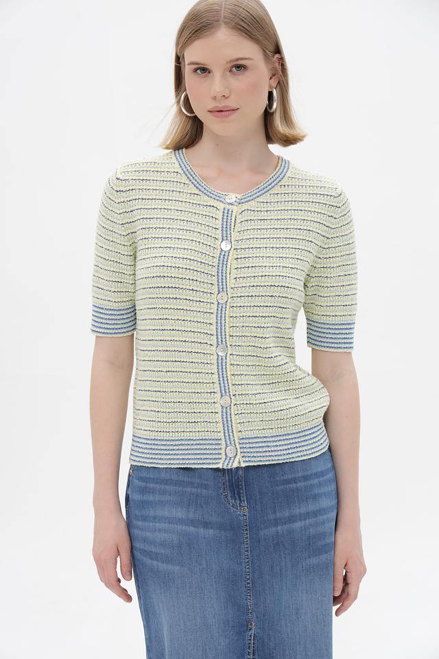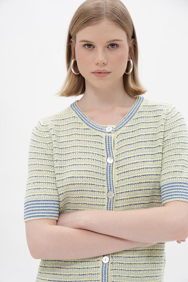 Жакет Rich and Royal светло-жёлтого цвета с полосатым узором станет стильным дополнением к вашему гардеробу. Модель с короткими рукавами и застёжкой на пуговицы, идеально подходит для создания модных образов. Состав: вискоза 70%, полиэстер 30%