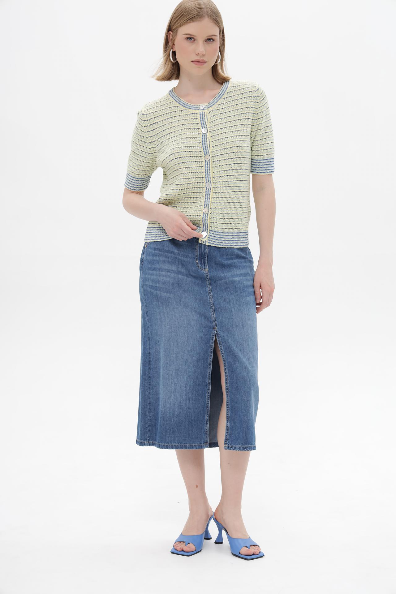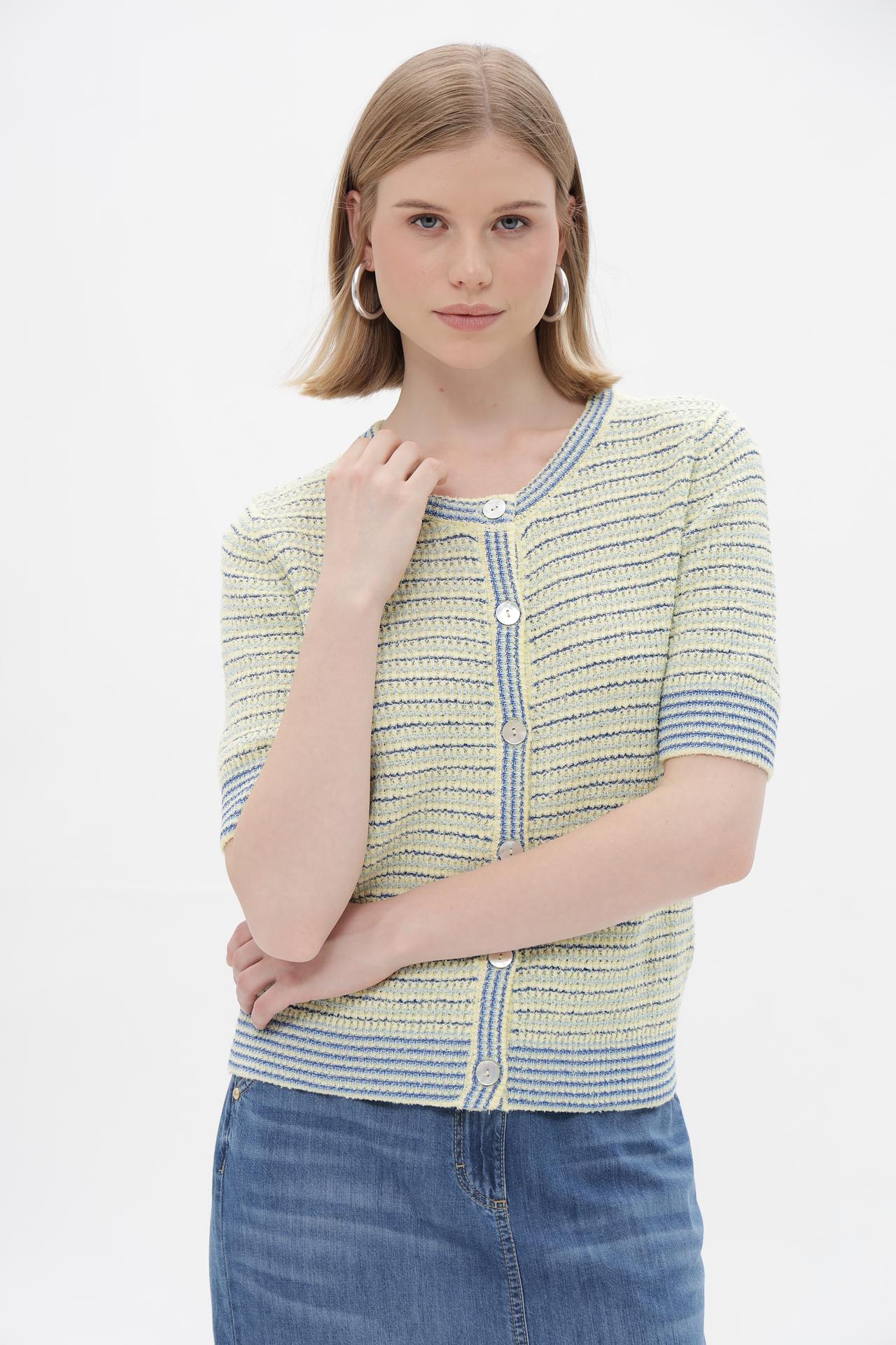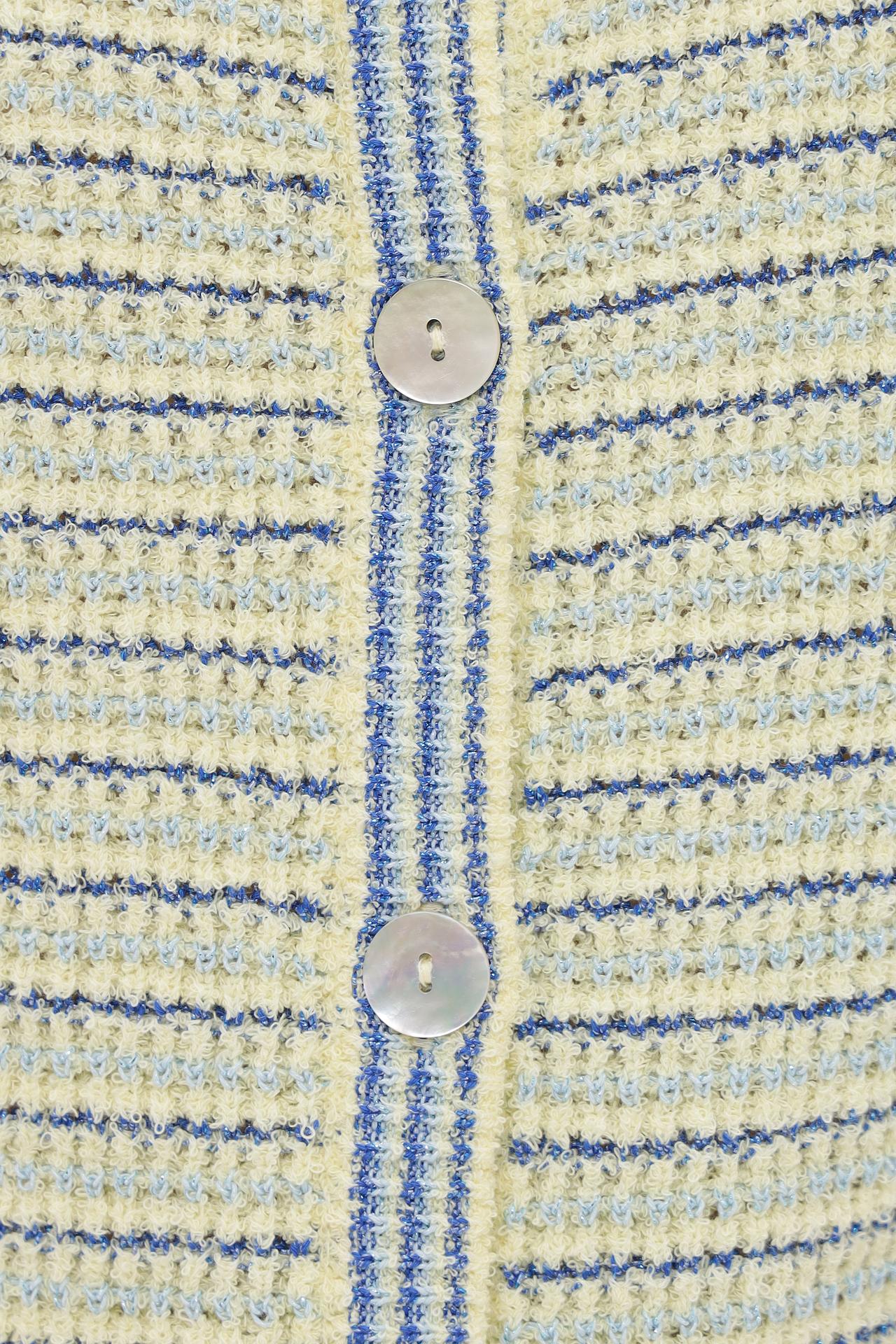 - Оригинальный дизайн: Полосатый узор в сочетании желтого, голубого и синего оттенков придает жакету свежий и современный вид. Перламутровые пуговицы служат изящным акцентом.