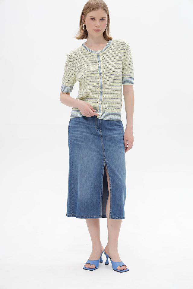 Этот жакет от Rich and Royal выполнен в светло-жёлтом цвете с вертикальными полосами голубого оттенка. Модель имеет короткий рукав и классическую застёжку на пуговицы. Жакет выполнен из сочетания вискозы и полиэстера, что обеспечивает комфорт и практичность в носке.