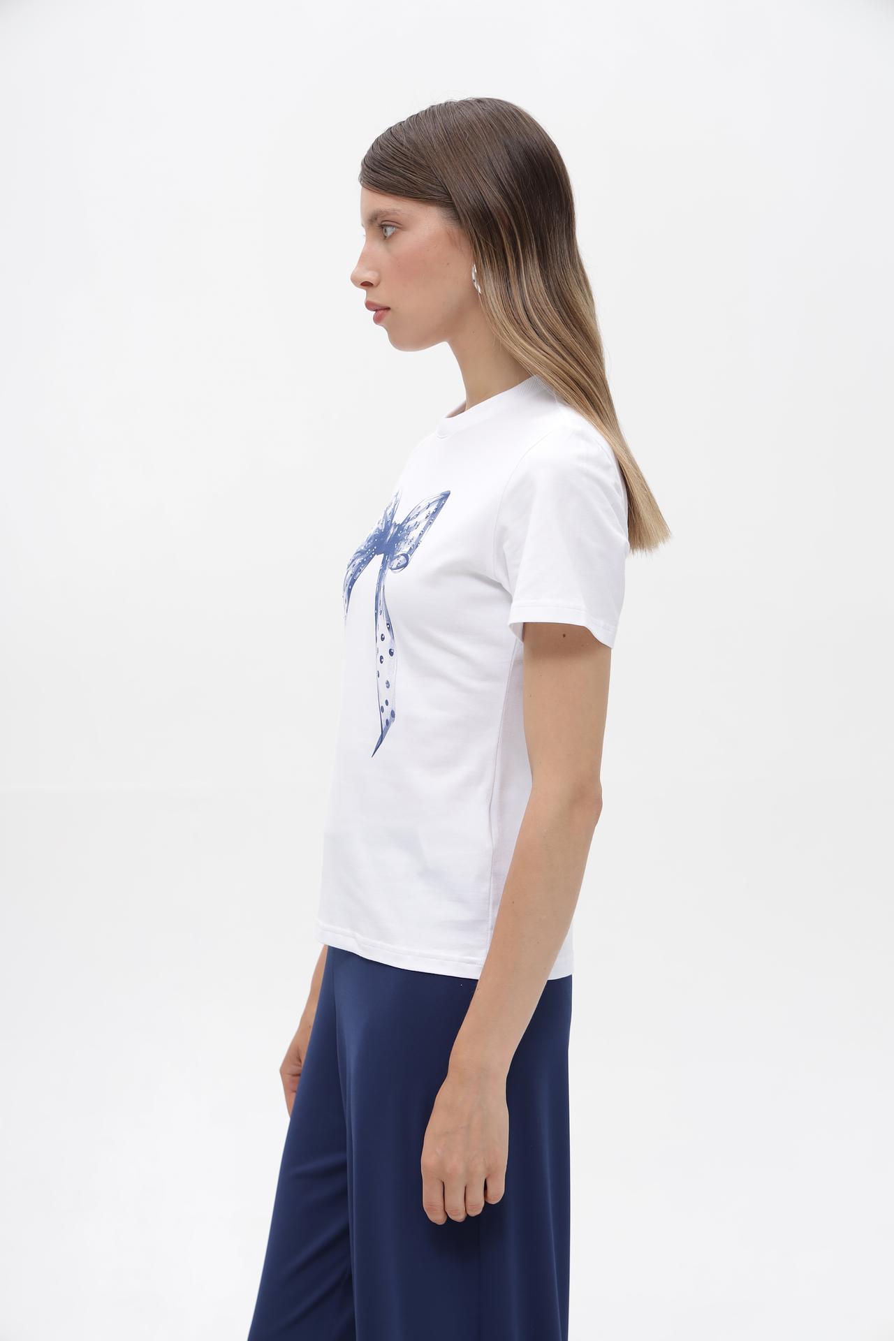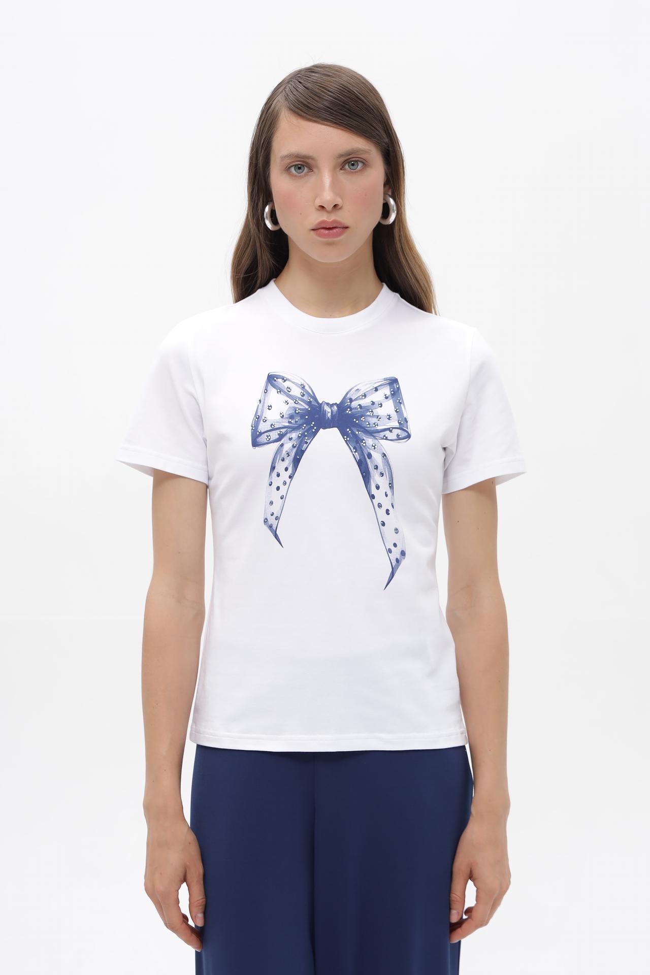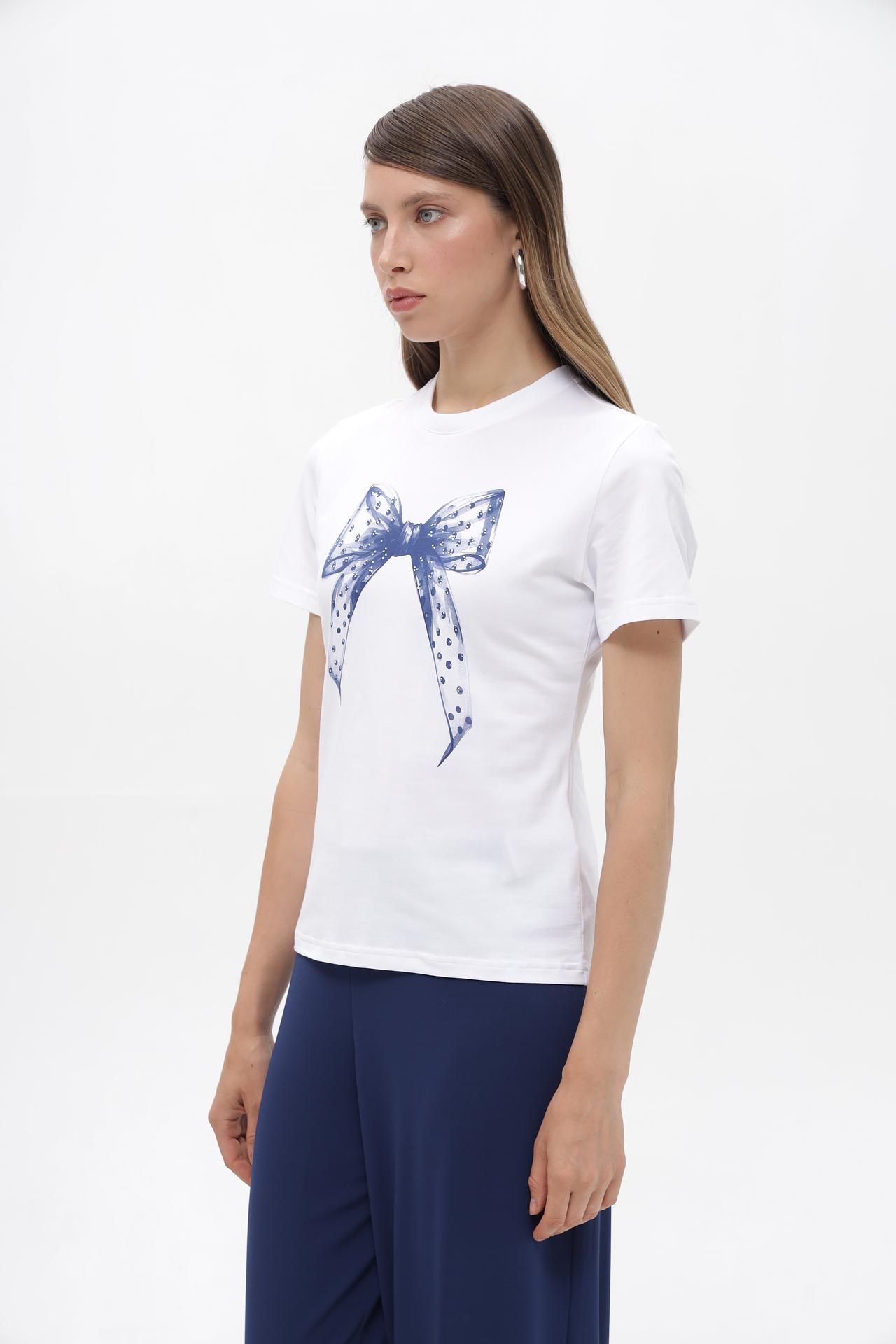 Элегантная белая футболка от Rich and Royal с изящным принтом в виде банта. Изготовлена из премиального хлопка с добавлением эластана, обеспечивающего комфорт и отличную посадку.