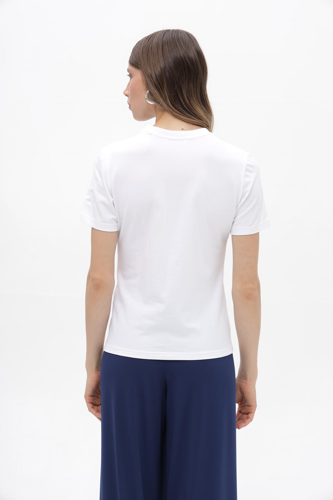 Эта футболка – идеальный выбор для создания стильного и женственного образа. Она прекрасно сочетается с различными элементами гардероба, от классических брюк до джинсов и юбок.
