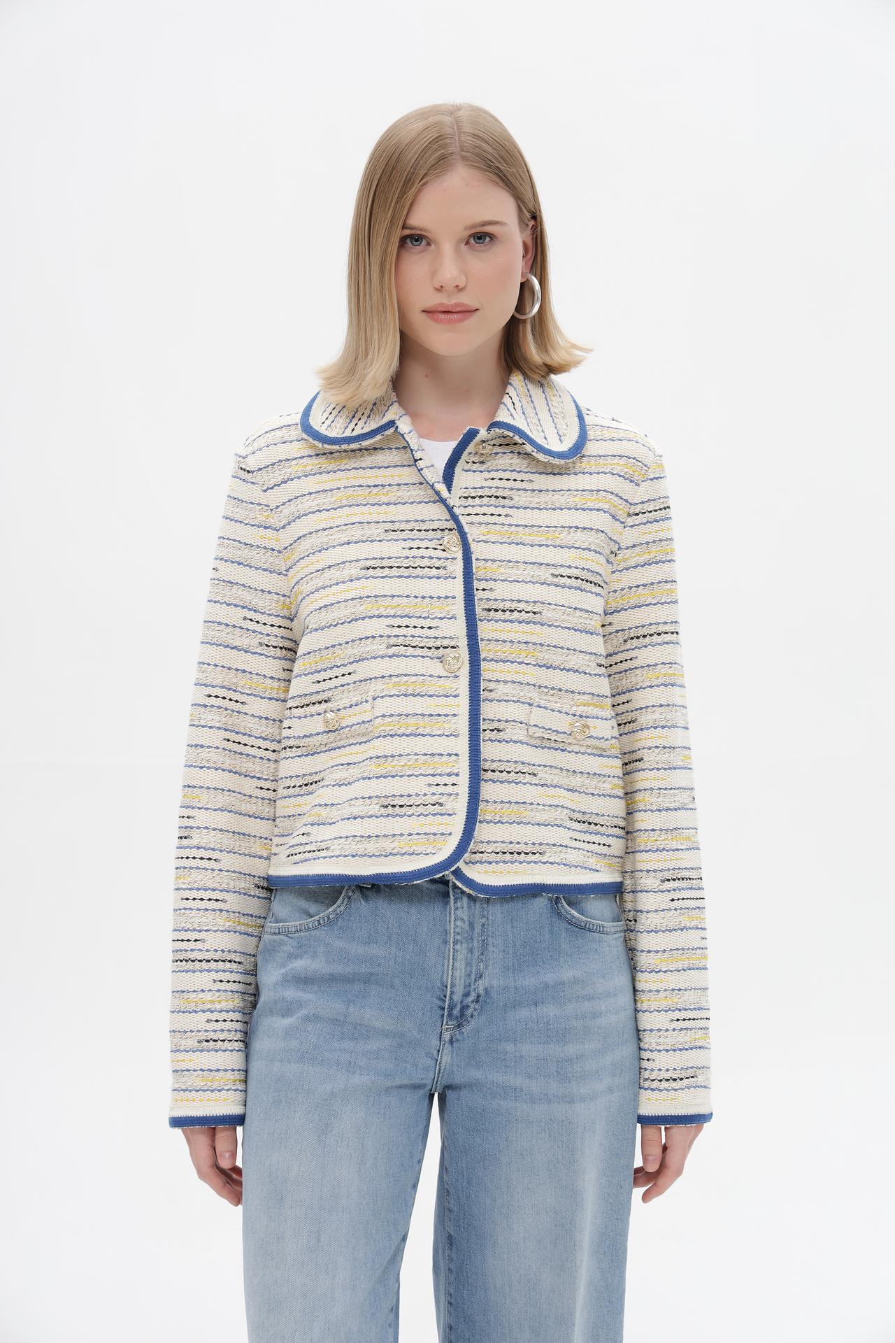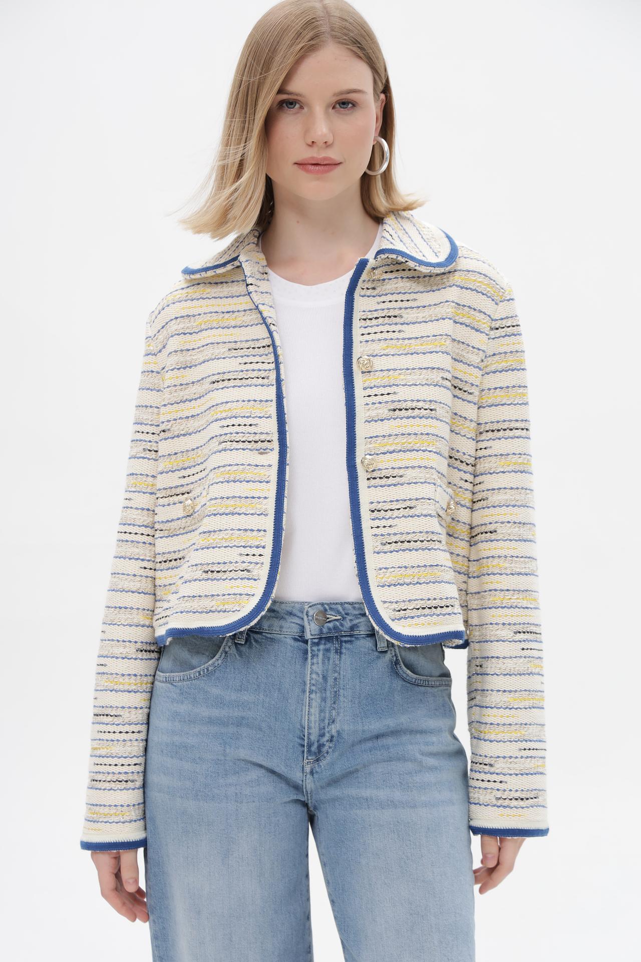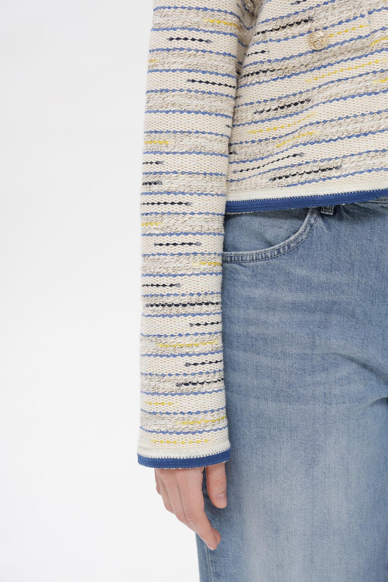 - Элегантный дизайн: Классический укороченный крой жакета идеально подчеркивает фигуру. Тонкий многоцветный твид в оттенках белого, синего и желтого придает модели особую изюминку. Декоративные золотистые пуговицы завершают образ, добавляя нотку роскоши.