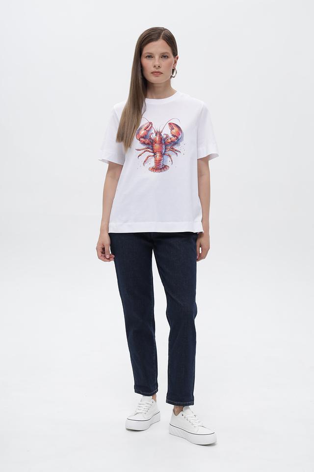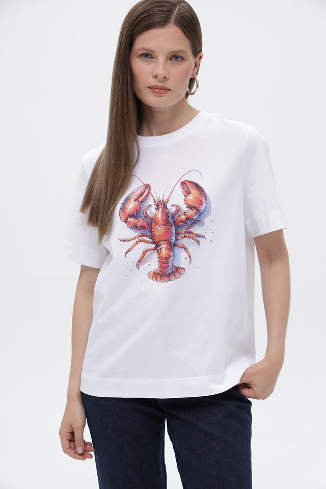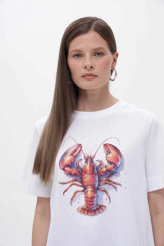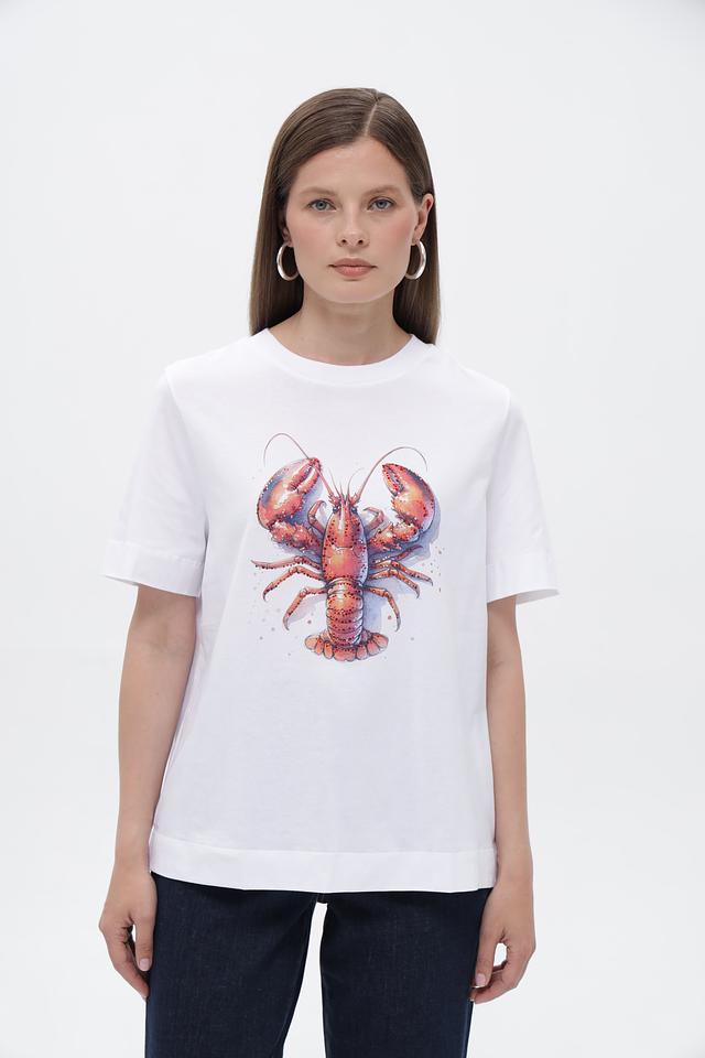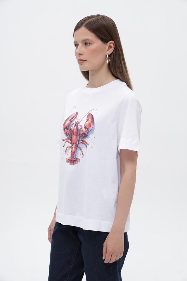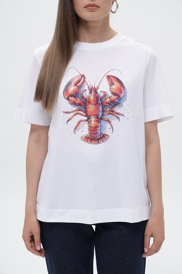 Женская футболка от бренда Rich and Royal выполнена в белом цвете и украшена эффектным принтом с изображением лобстера.
