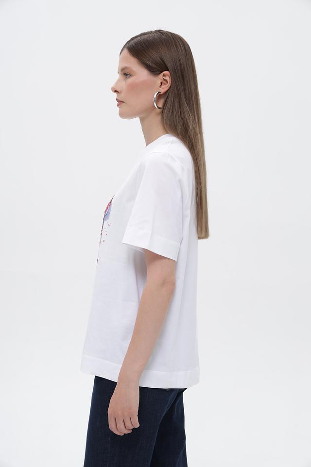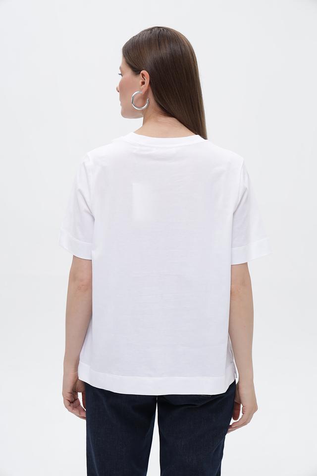 Модель имеет свободный крой, который обеспечивает комфорт и свободу движений. Классический круглый вырез горловины и короткие рукава делают футболку универсальной и подходящей для повседневной носки.