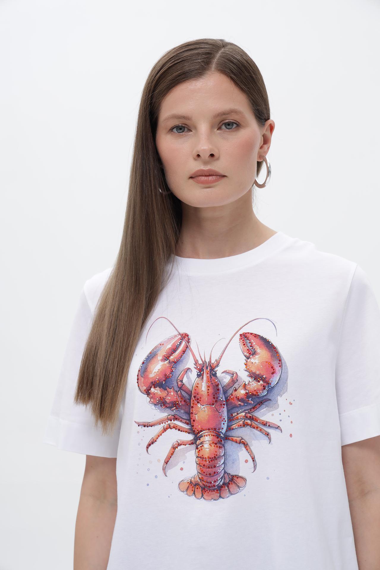 - Универсальность стиля: Данная футболка легко комбинируется как с джинсами и шортами, так и с юбками и брюками. Белая футболка с принтом лобстера легко впишется в городской шик или кэжуал стиль, становясь основой для ваших экспериментов.