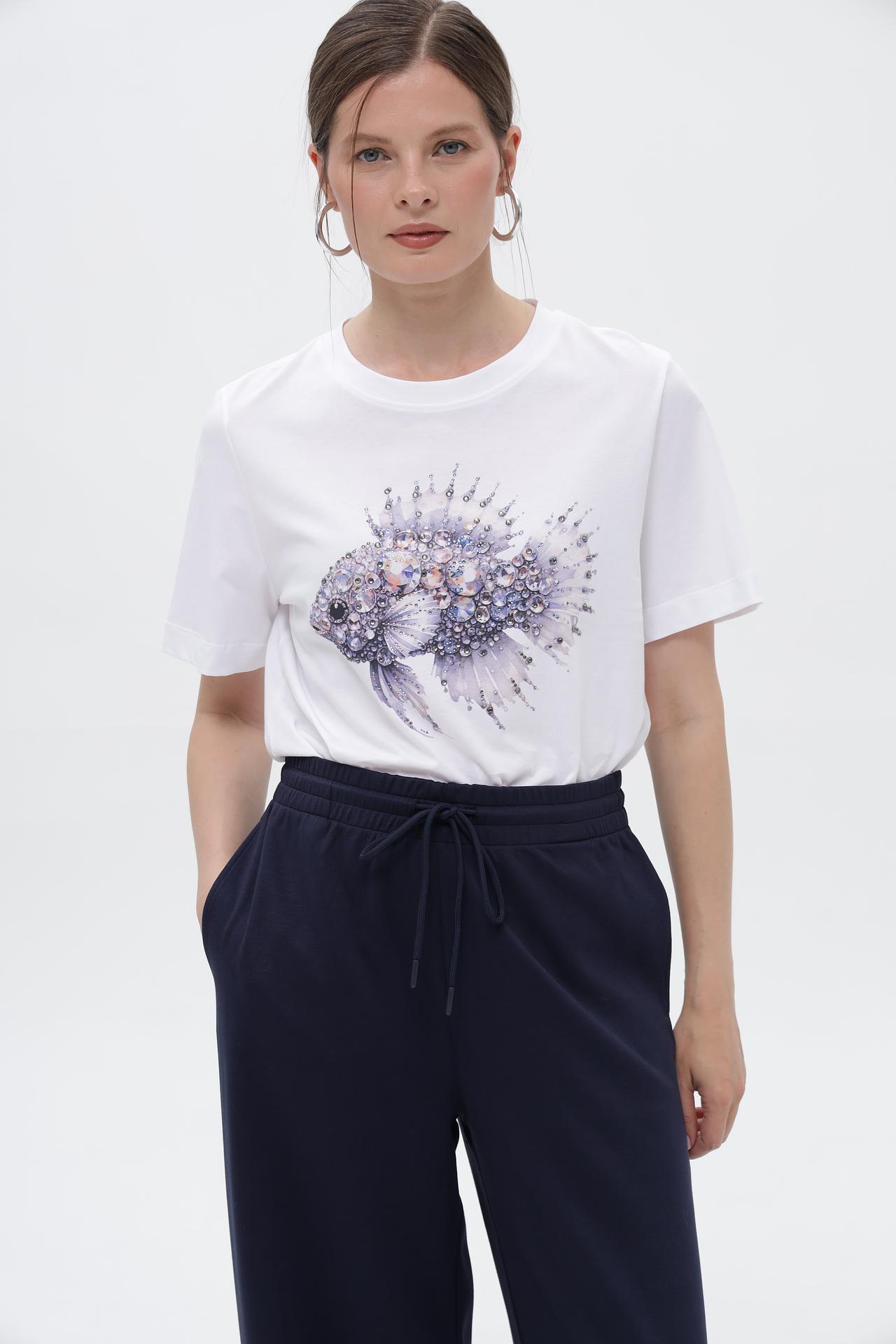 Стильная женская футболка Rich and Royal, выполненная из 100% хлопка, станет отличным дополнением вашего гардероба. Футболка выполнена из дышащего материала, обеспечивающего комфорт в течение всего дня. Белая футболка с ярким принтом рыбы — это идеальный выбор для тех, кто ценит стиль и комфорт.