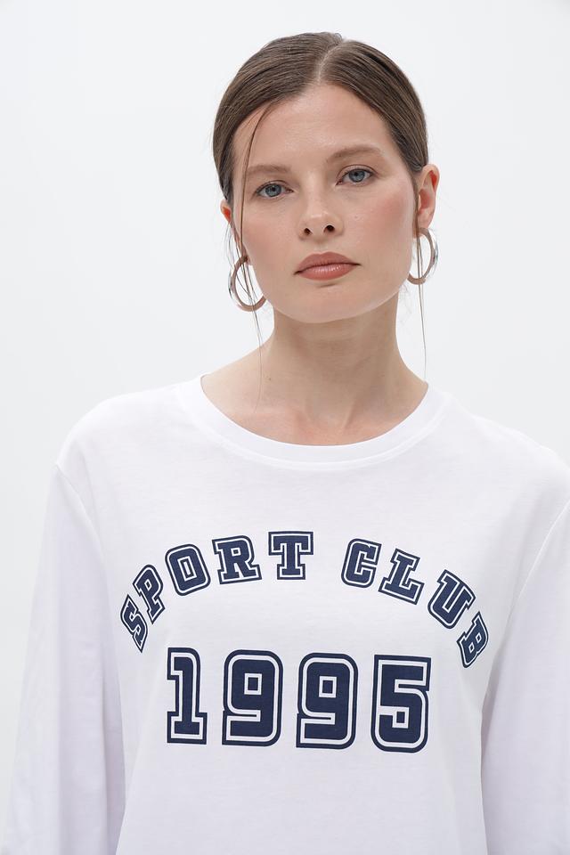 Особенность этой футболки — стильный принт “Sport Club 1995”, выполненный в синем цвете. Принт придает образу непринужденность и спортивный шик. Футболка имеет классический круглый вырез и свободный крой, который не сковывает движений.