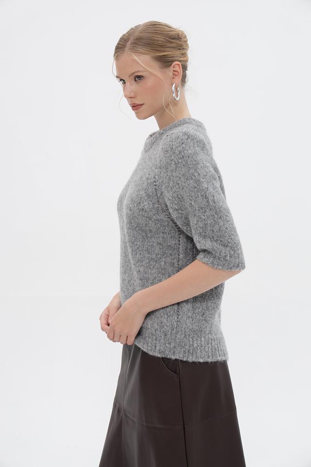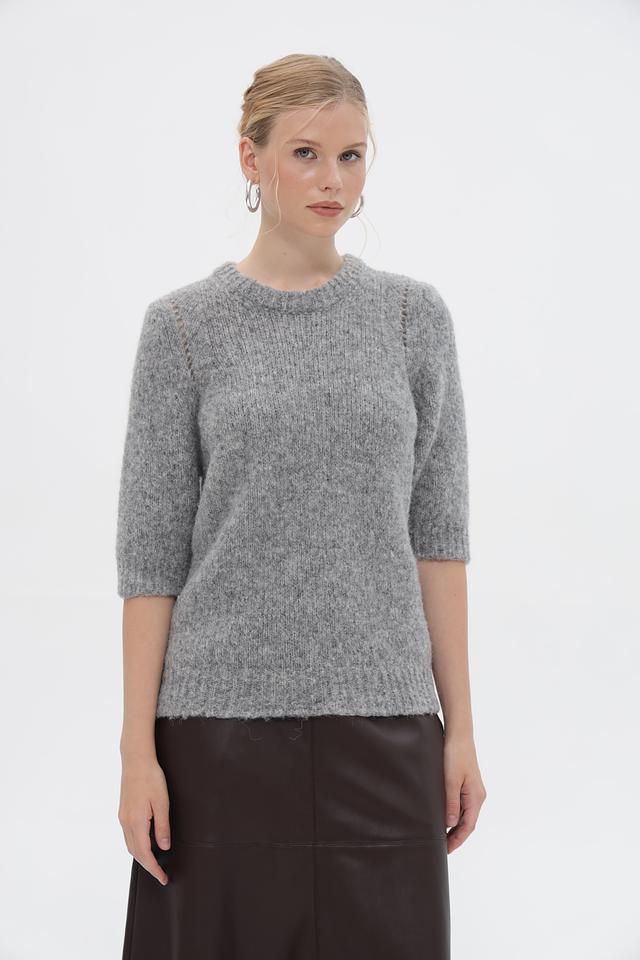 Серый пуловер от Rich and Royal из мягкой пряжи с добавлением альпаки. Модель с короткими рукавами и округлым вырезом горловины. Состав: полиамид, шерсть, альпака, акрил. Состав: акрил 32%, альпака 30%, полиамид 26%, шерсть 12%