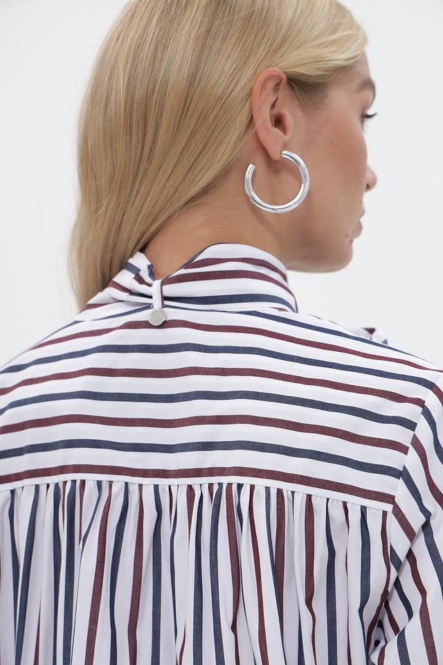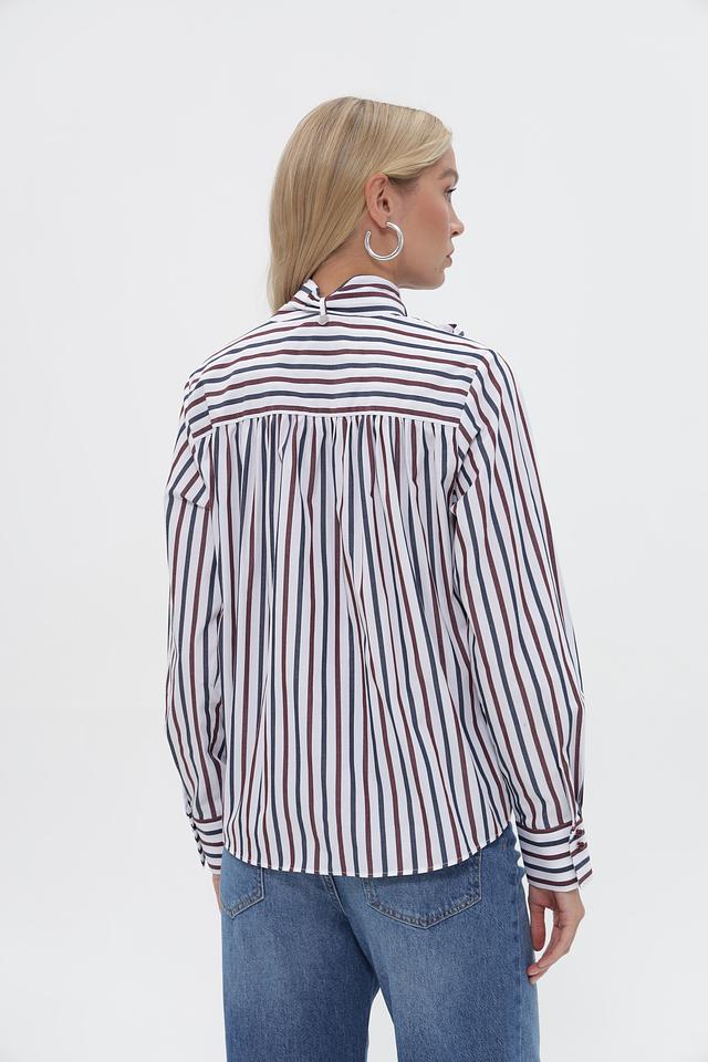 Представляем стильную блузку от бренда Rich and Royal. Модель выполнена в классическую полоску из сочетания белого, синего и бордового цветов.