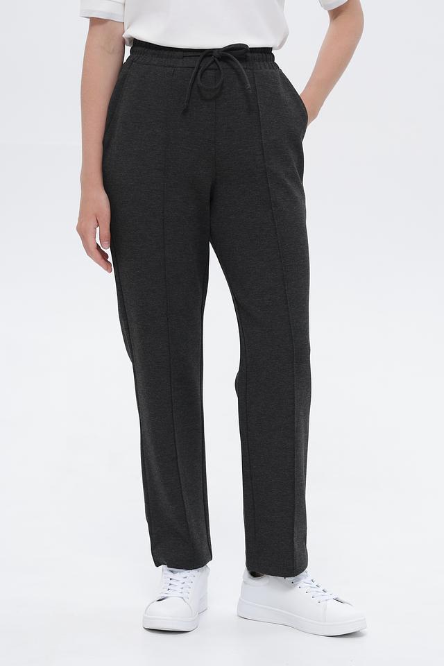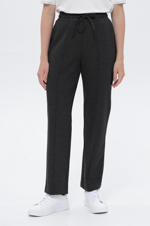 Брюки имеют классический крой с вертикальными вытачками, которые визуально удлиняют силуэт. Пояс на резинке дополнен функциональными завязками, обеспечивающими идеальную посадку по фигуре. Наличие боковых карманов делает модель практичной и удобной в повседневной носке.