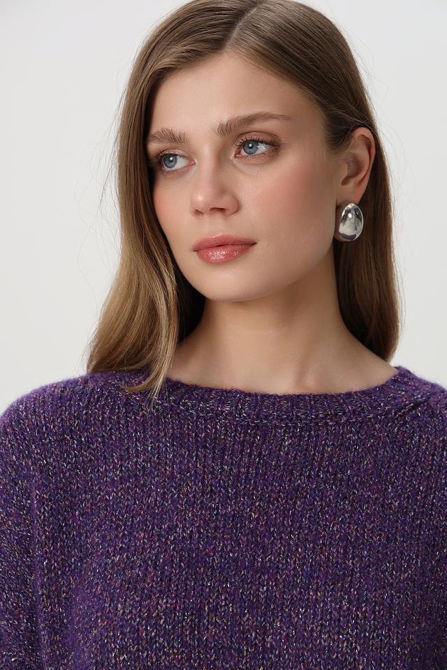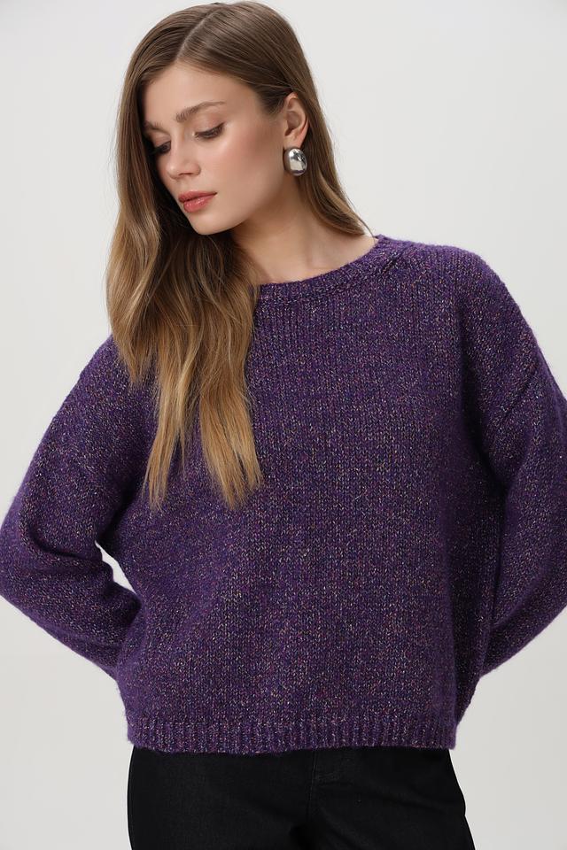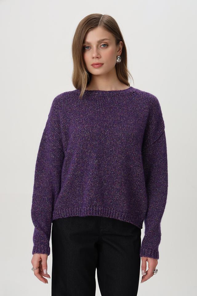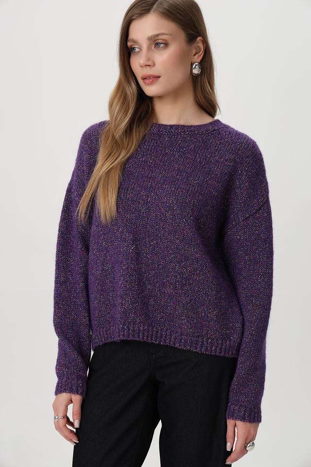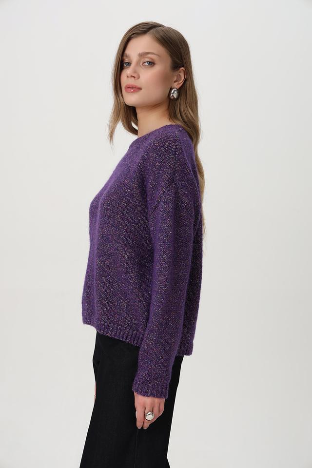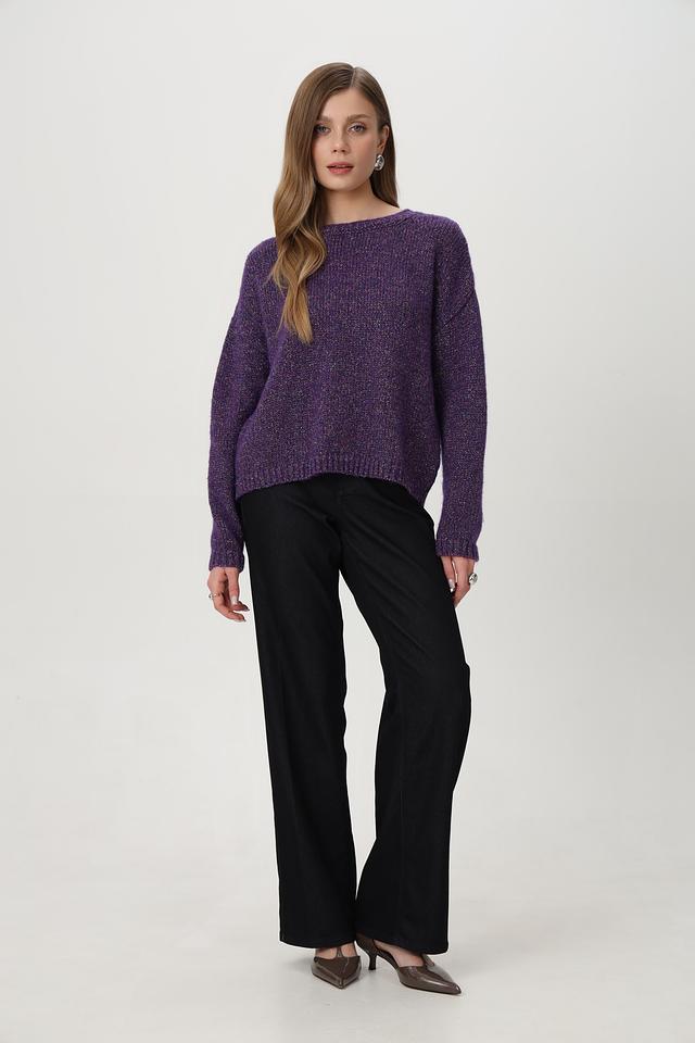 Фиолетовый пуловер от Rich and Royal из смесовой шерсти с добавлением блестящих нитей. Модель имеет округлый вырез горловины и свободный крой. Состав включает шерсть, полиэстер и полиамид. Состав: шерсть 34%, полиамид 27%, полиакрил 13%, полиэстер 10%, метализ.нить 7%, шелк 5%, хлопок 4%