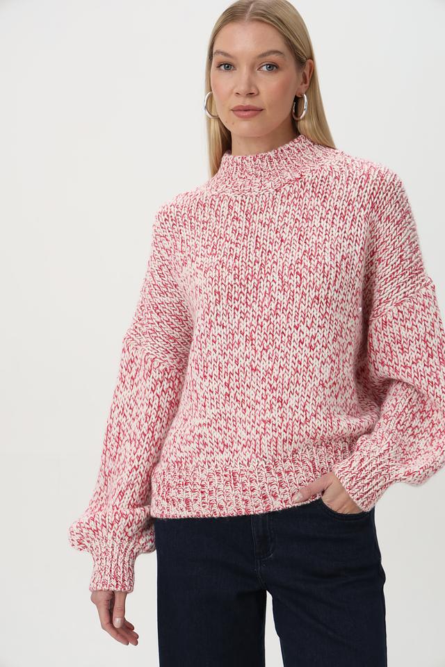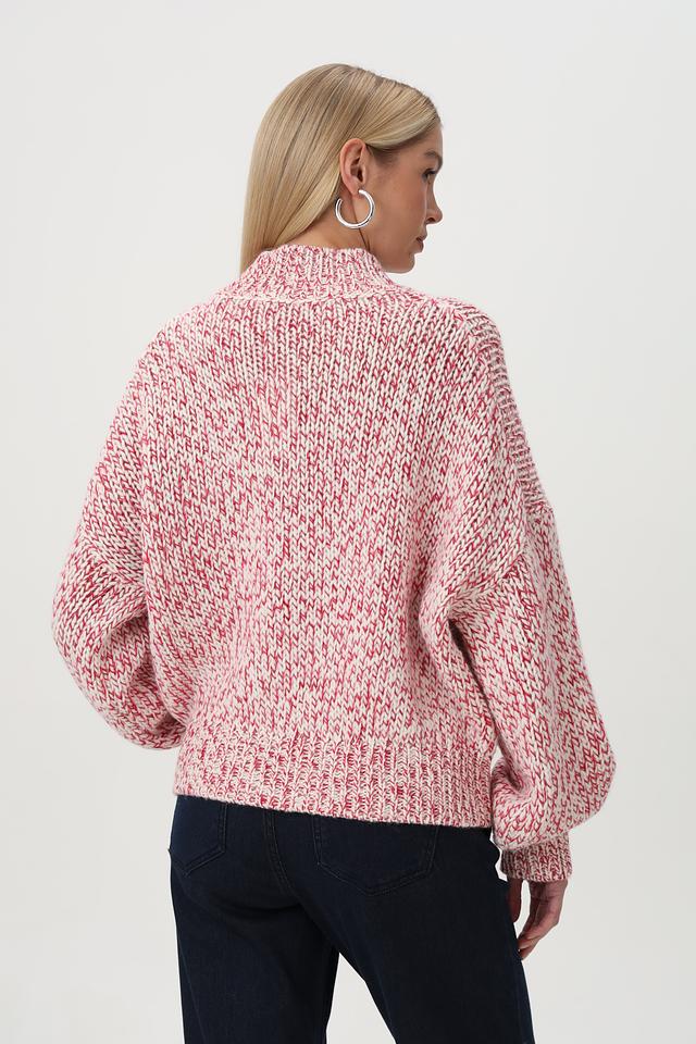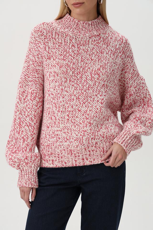 Пуловер имеет удобный крой с горловиной-водолазкой и объёмными рукавами, которые добавляют образу женственности и лёгкости. Текстура крупной вязки делает этот пуловер особенно привлекательным и интересным.