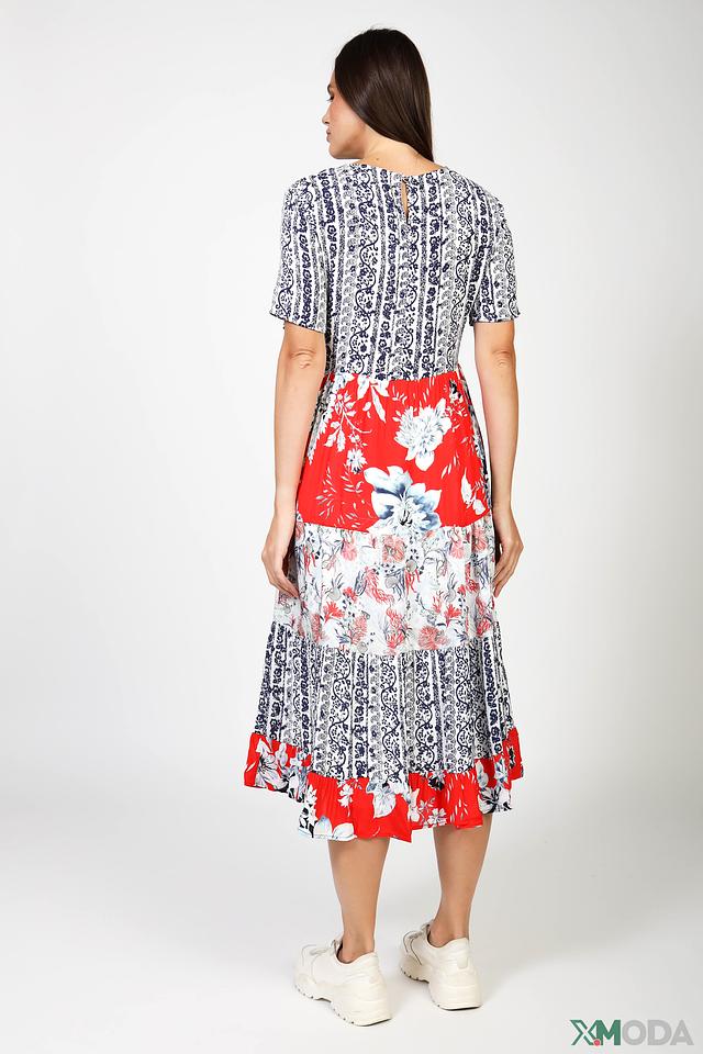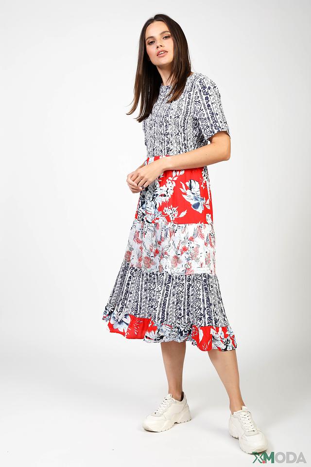 Платье имеет яркий цветочный принт, сочетающий в себе красный, белый и синий цвета. Верх платья выполнен в мелкий цветочный рисунок, а нижняя часть – в более крупный. Многослойная юбка придает платью легкость и воздушность. Короткие рукава делают платье идеальным для теплой погоды.