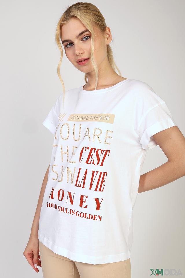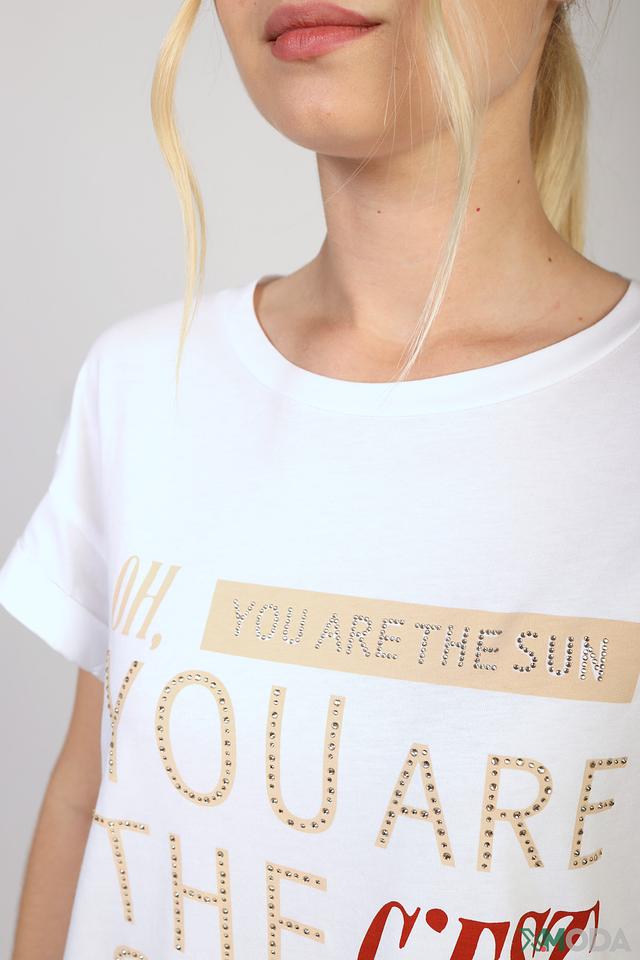 Особенностью данной модели является яркий принт с надписями и декоративными элементами, выполненными в золотистом цвете. Принт придает футболке индивидуальность и стиль.