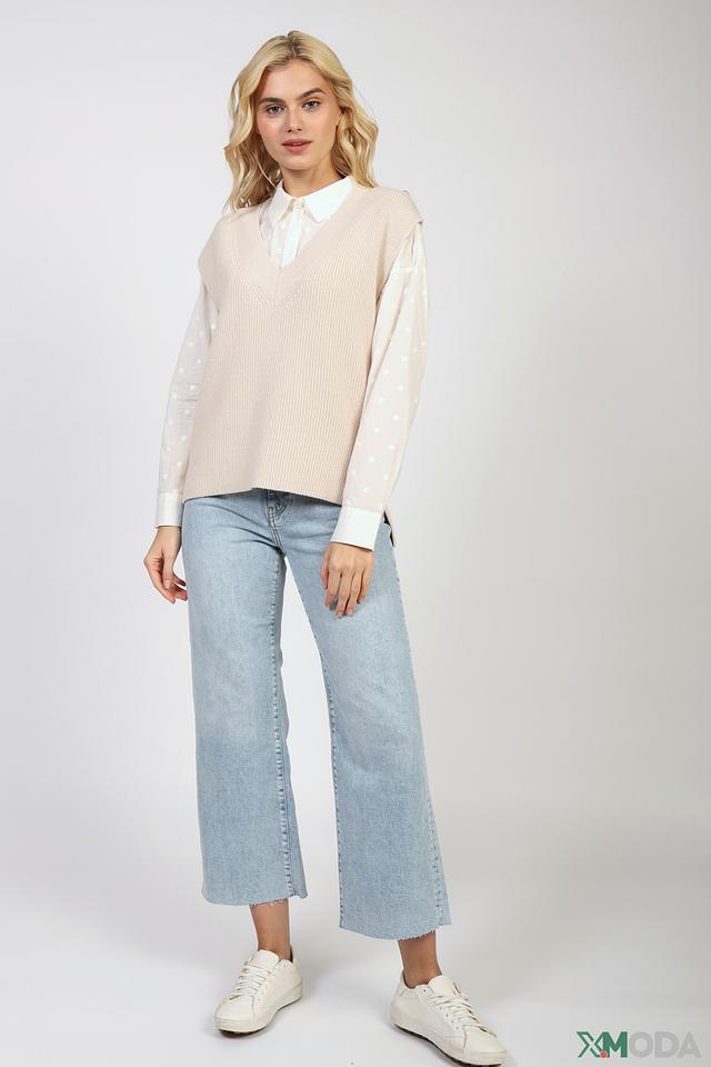 Модель имеет классический V-образный вырез, который визуально удлиняет шею и делает силуэт более изящным. Прямой крой обеспечивает комфортную посадку по фигуре и позволяет легко сочетать жилет с различными элементами одежды.